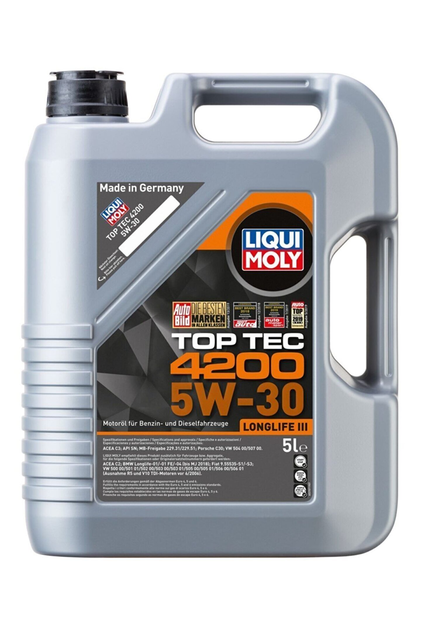 TOP TEC 4200 LONGLIFE III 5W30 Motor Yağı 5 Litre Benzinli ve dizel modern motorların tamamında kullanılabilen, ileri teknoloji katık karışımı ile güçlendirilmiş sentetik motor yağı.; 3. neslin sentez teknolojisine dayanan yüksek kaliteli düşük viskoziteli motor yağı yüksek performans sayesinde motoru mükemmel temizler.; Yağ tüketimini düşürür.; Dizel partikül filtresinin işler kalmasını sağlar ve maksimum ömür sunar.; Motor aşınmalarına karşı mükemmel koruma sağlar, yağ ve yakıt tüketimini azaltır.; DI dizel ve benzinli motorlar ile FSI, TDI ve Common Rail motorlar için uygundur.; Araç üreticilerinin tavsiyelerine bağlı olarak 50,000 km'ye veya düşük kilometre yapan sürücüler için 2 seneye varan uzun yağ değişim aralıkları sağlar.; Gazlı (LPG / CNG) binek araçlar için uygundur.; Kullanım Özellikleri ve Faydaları Motorun yumuşak çalışmasını sağlar.; Aşınmaya karşı olağanüstü koruması nedeniyle uzun motor ömrü sağlar.; Düşük sıcaklıklarda hızlı yağlama sağlar.; Her motor devrinde uygun yağ basıncı sağlar.; Düşük ve yüksek sıcaklıklarda yağlamanın güvenilir seviyede olmasını sağlar.; Uzun ömürlüdür.; Yakıt tüketimini ve egzoz emisyonunu azaltır.; Çok iyi motor temizliği sağlar.; Turbo ve Katalitik Konvertörlü araçlar için uygundur.; Dizel Partikül Filtreli (DPF) araçlarda kullanılabilir.; TARAFINIZA ULAŞACAK ÜRÜN GÖRSELDEKİ İLE BİREBİR AYNIDIR Teslimi.; Ücretsiz Kargo.; İsminize veya Şirketinize Faturalı Toplu Siparişler İçin Bize Ulaşın.; OtoBalcı Bu İlan ENTEGRA Entegrasyon Sistemleri ile Listelenmiştir