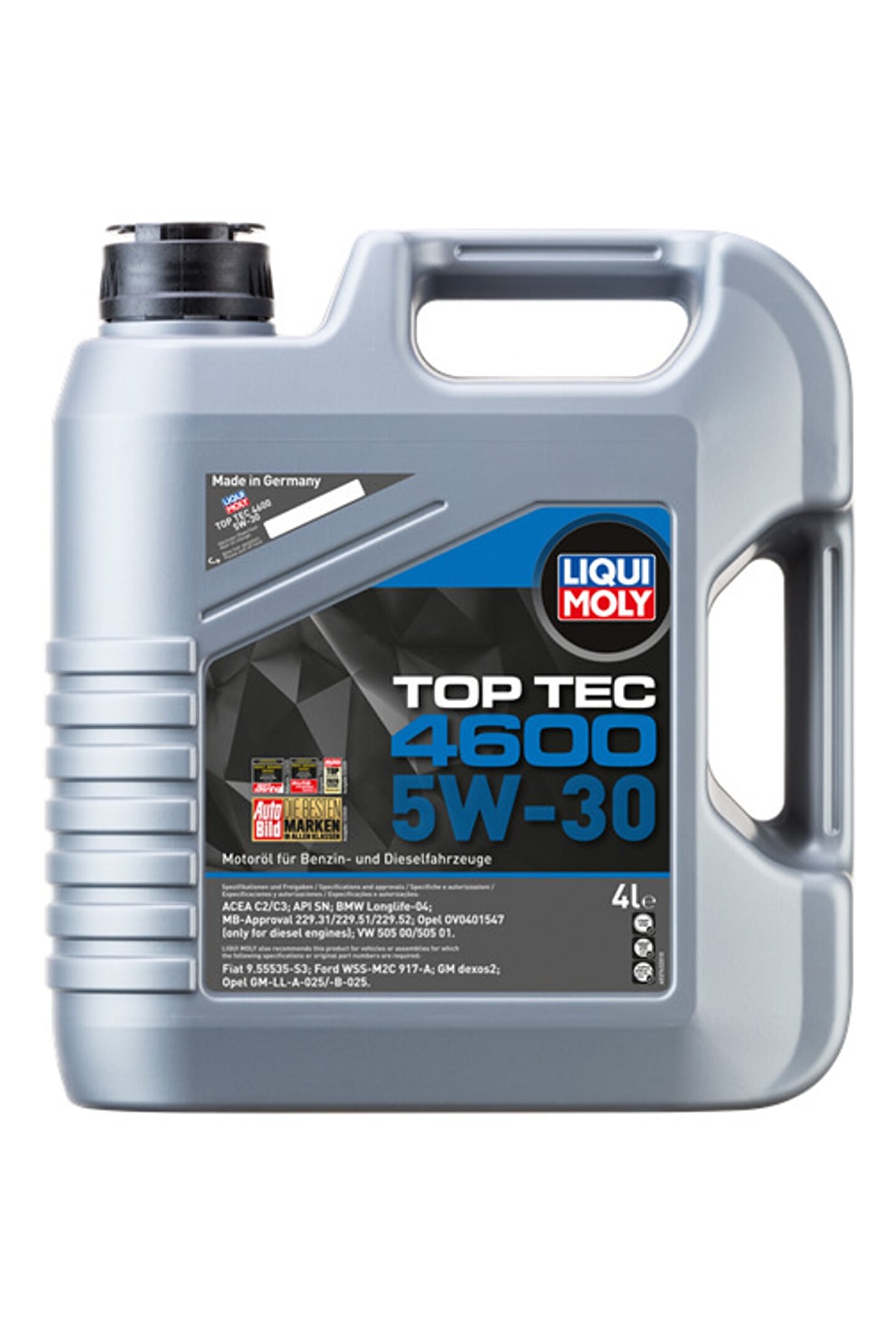 Liqui Moly Top Tec 4600 5W-30 Benzinli araçlar için ve ve partikül filtresi olmadan dizel araçlar için uygundur. Ya da dizel partikül filtreleri (DPF) ve egzoz gazı turbo olmadan benzinli ve dizel motorlarda Modern üst sınıf düşük sürtünme motor yağı tüm sezon için kullanılması.Birlikte en yeni katık teknolojisiyle, sentetik teknolojisini kullanarak unconventio nal temel yağların kombinasyonu, motorun hemen yağ ile birlikte verilir sağlarken, yağ ve yakıt tüketimini aşınmaya karşı olağanüstü koruma sağlar ve azaltan bir motor yağı garanti. Bu ürün üreticinin özelliklerine bağlı olarak, en fazla 40.000 km yağ değişim aralıkları için izin verir. Kullanım amacıçok valfli teknoloji noloji, Valvetronic ve (veya şarj hava soğutması olmadan) turbo şarjlı, modern benzinli ve dizel motorlar için optimum. Özellikle uygun yağ değişimi ve ağır motor gereksinimleri arasında uzun aralıklar olduğu yerde. Ayrıca gazla çalışan araçlar (CNG / LPG) için uygundur.Katalitik con sürücülerle ve turbo şarj güvenli test edilmiştir. Onaylar ACEA C3; API CF; API SN; BMW Longlife-04; GM ™ dexos2; MB-Freigabe 229,31; MB-Freigabe 229.51; MB-Freigabe 229,52; VW 502 00; VW 505 00; VW 505 01 LIQUI MOLY aşağıdaki özelliklere sahip araçlar için bu ürünü tavsiye eder: ACEA A3; ACEA B4; Ford WSS-M2C 917-A; Opel GM-LL-A-025; Opel GM-LL-B-025