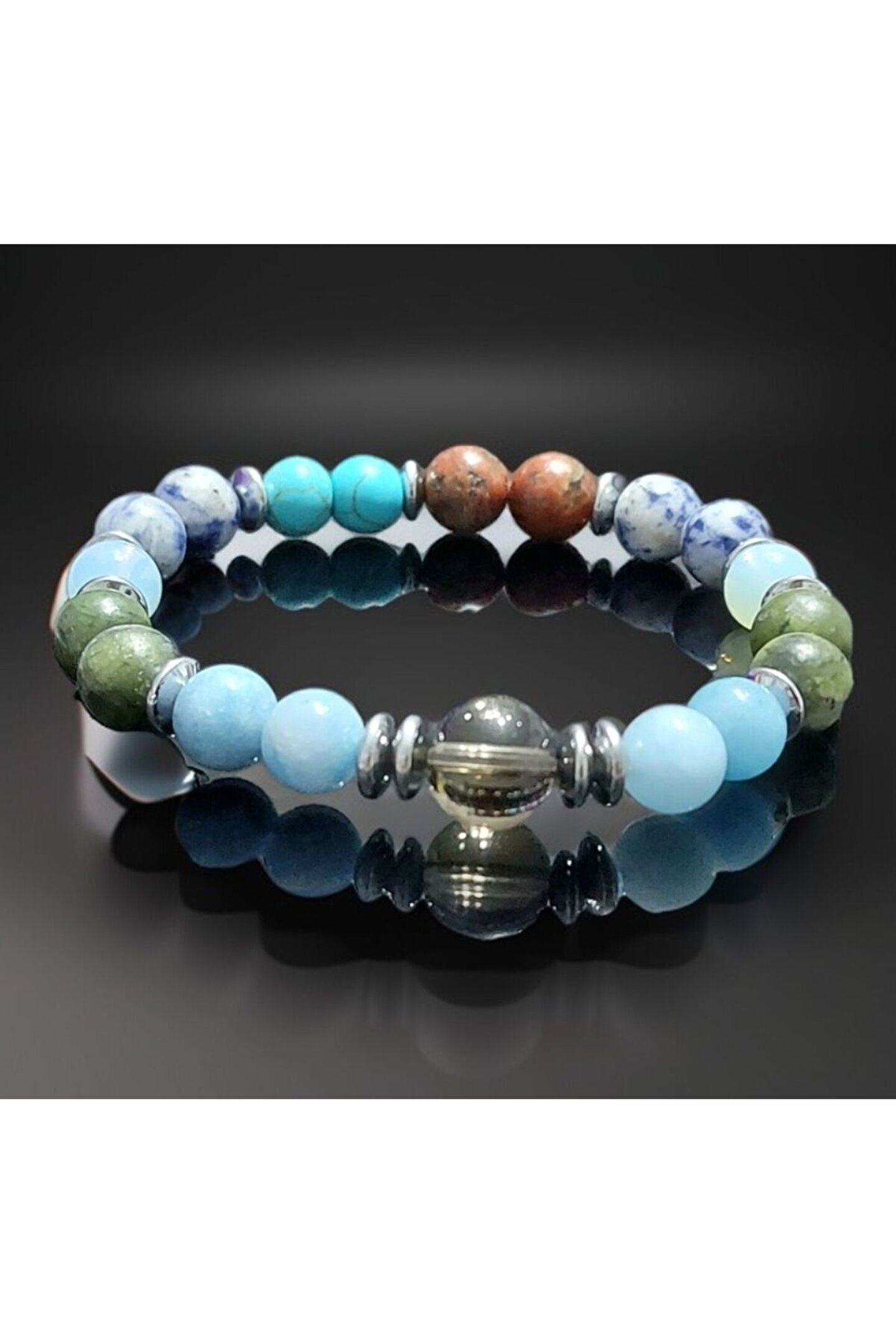 ??Yeşim aytaşı jasper sodalit Turkuaz AKUAMARİN Dumanlı kuvars hematit taşları ile Hazırlamış olduğumuz bağışıklık sistemini güçlendirici unisex bileklik ??Doğal taşlar içerdiği mineraller sayesinde ve kendilerine has titreşimleri ile insan vücudunda olumlu etkilere sahiptirler. ??Taşlar bünyesinde bulundurduğu mineraller yardımı ile bedenimizde mineral bakımından eksiklikler var ise bunları tamamlamaya yardımcı olur. ??Vücudumuza yaydığı enerji ile çakraları dengelemeyi sağlarken ruh sağlığımızı korur, negatif enerjileri emip pozitif enerji yayar.??Değerli doğal taşların özellikleri ve faydalarını; %100 tedavi yöntemi olarak değil, sorunumuzun yada eksikliğimizin giderilmesinde yardımcı bir alternatif olarak değerlendirmeliyiz. ??Bu modelde esnek misina kullanılmıştır.ürünlerimiz kendi tasarımımızdır.??Doğaltaşlar kesim itibari ile renk ve şekil değişikliği gösterebilmektedir
