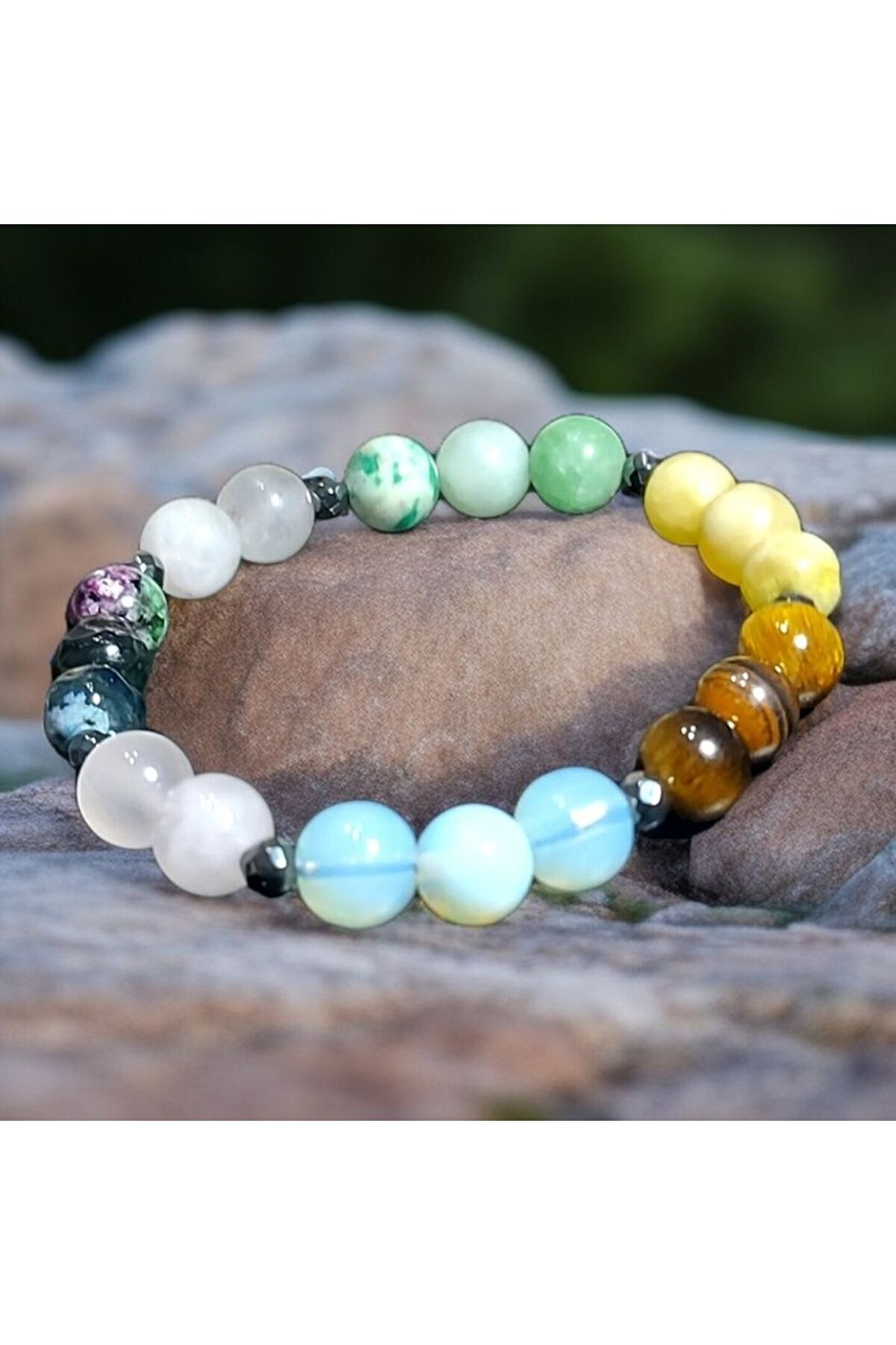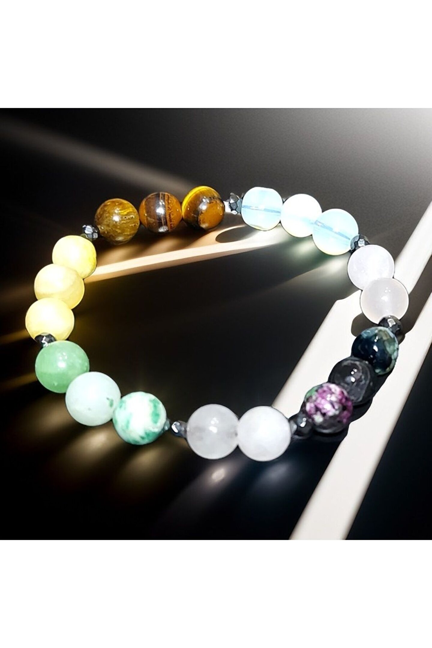 ??Doğal taşlar içerdiği mineraller sayesinde ve kendilerine has titreşimleri ile insan vücudunda olumlu etkilere sahiptirler. ??Taşlar bünyesinde bulundurduğu mineraller yardımı ile bedenimizde mineral bakımından eksiklikler var ise bunları tamamlamaya yardımcı olur. ??Vücudumuza yaydığı enerji ile çakraları dengelemeyi sağlarken ruh sağlığımızı korur, negatif enerjileri emip pozitif enerji yayar.??Değerli doğal taşların özellikleri ve faydalarını; %100 tedavi yöntemi olarak değil, sorunumuzun yada eksikliğimizin giderilmesinde yardımcı bir alternatif olarak değerlendirmeliyiz. ??Bu modelde esnek misina kullanılmıştır.??ürünlerimiz kendi tasarımımızdır. ??Doğaltaşlar kesim itibari ile renk ve şekil değişikliği gösterebilmektedir.??Pembe kuvars kalsit anyolit amozonit Güneş taşı aytaşı lav taşları ile Hazırlamış olduğumuz uykusuzluk bilekliği..
