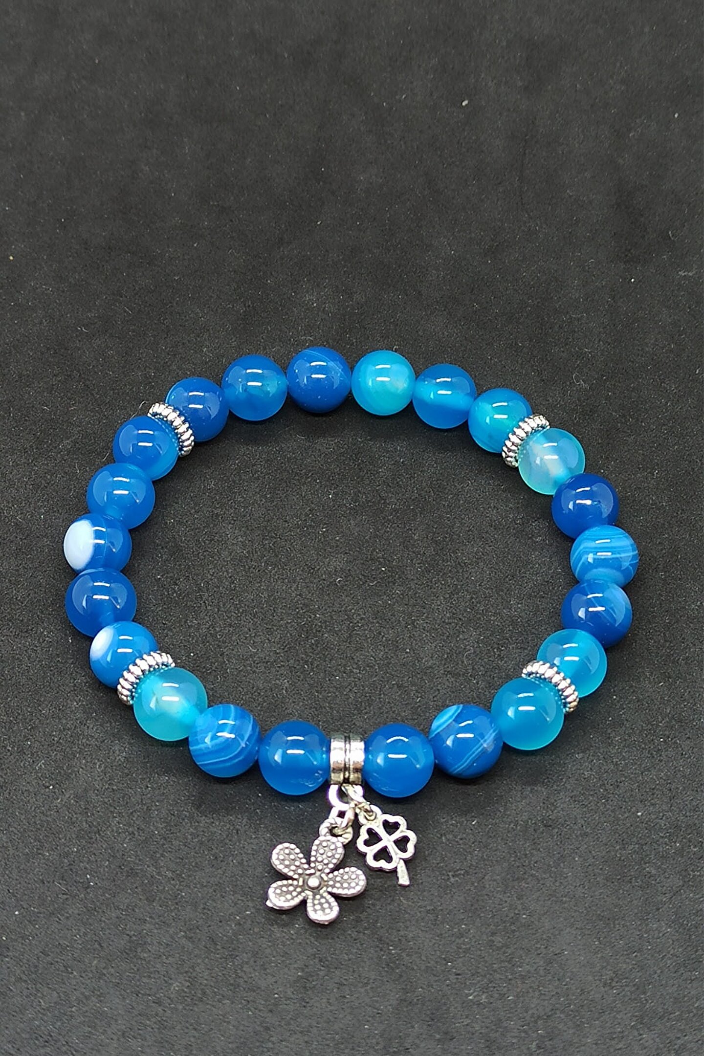 Doğal akik taşı kullanılarak üretilmiş, zarif ve otantik bir aksesuar deneyimi sunar; Moskova'da el işçiliği ile hazırlanmış, her bir bileklik benzersiz ve özgün bir tasarıma sahiptir; Mavi akik taşı, bileklikte doğal güzelliğini ve şıklığını ön plana çıkarır;
