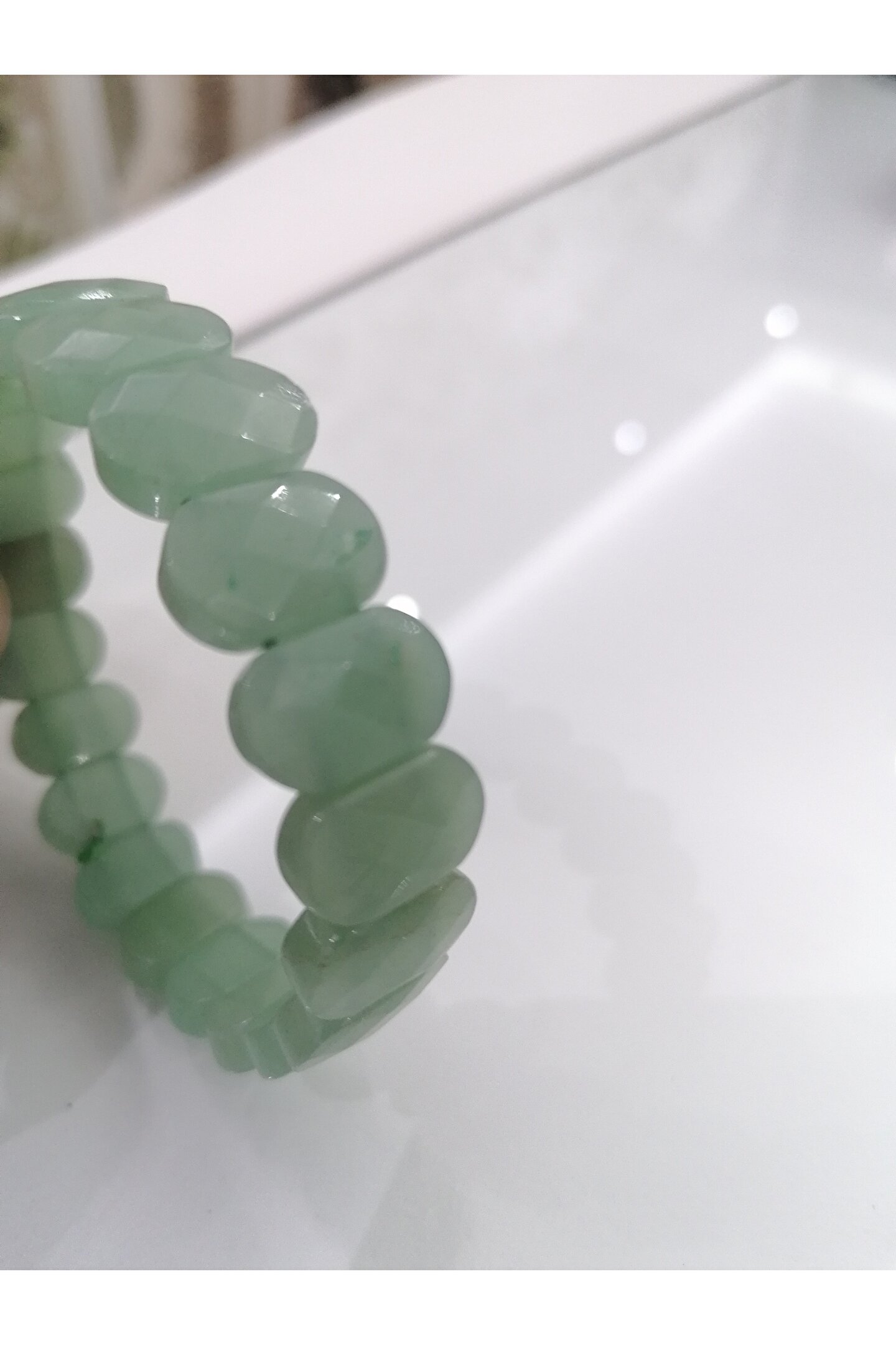 Aventurin doğal taş bileklik, şıklığınızı tamamlayacak zarif bir aksesuardır; Özel kesim tasarımı ile göz alıcı bir görünüm sunar ve her türlü kıyafetle uyum sağlar; Doğal taş kullanımı sayesinde her bileklik benzersizdir ve doğanın güzelliklerini bileğinizde taşımanızı sağlar; 8x14mm boyutlarındaki taşlar, bileklikte zarif bir doku oluşturarak sofistike bir stil vurgular;
