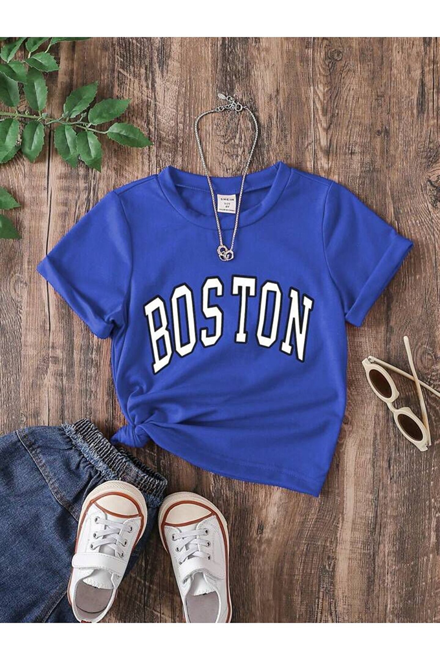 Kız-Erkek Çocuk Saks Mavi Boston Baskılı Penye Tişört