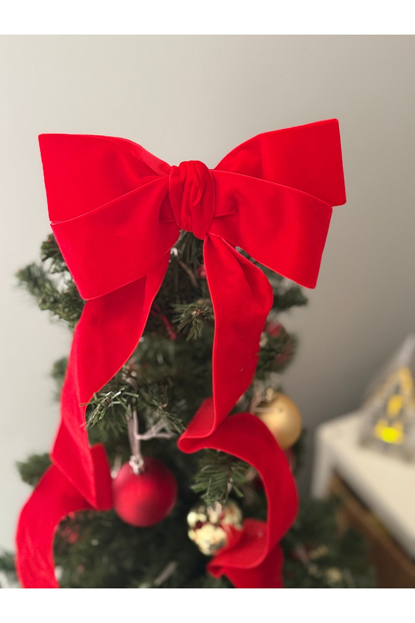 Lovein Atelier Büyük Kırmızı Kadife Fiyonk Kurdele Ağaç Süsü Yeni yıl,Yılbaşı,Dekor