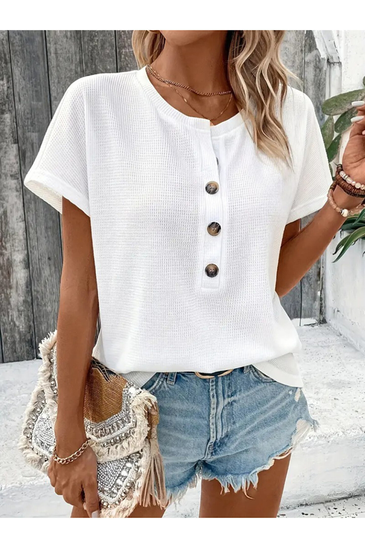 Kadın Kısa Kollu Yakası Açık önden Düğmeli Waffle Bluz