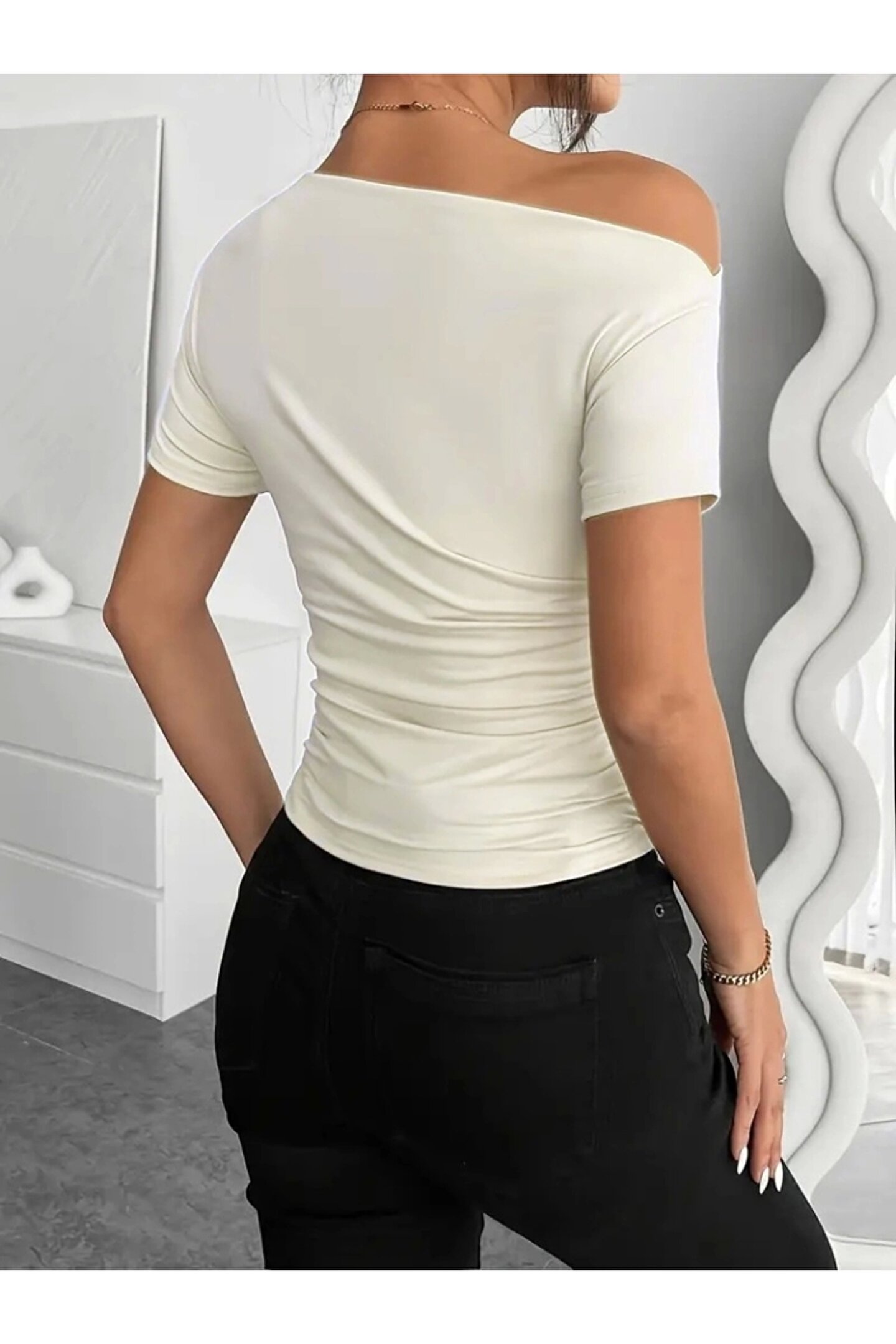 Kadın Kısa Kollu Tek Omuzu Açık Büzgülü Viskon Bluz