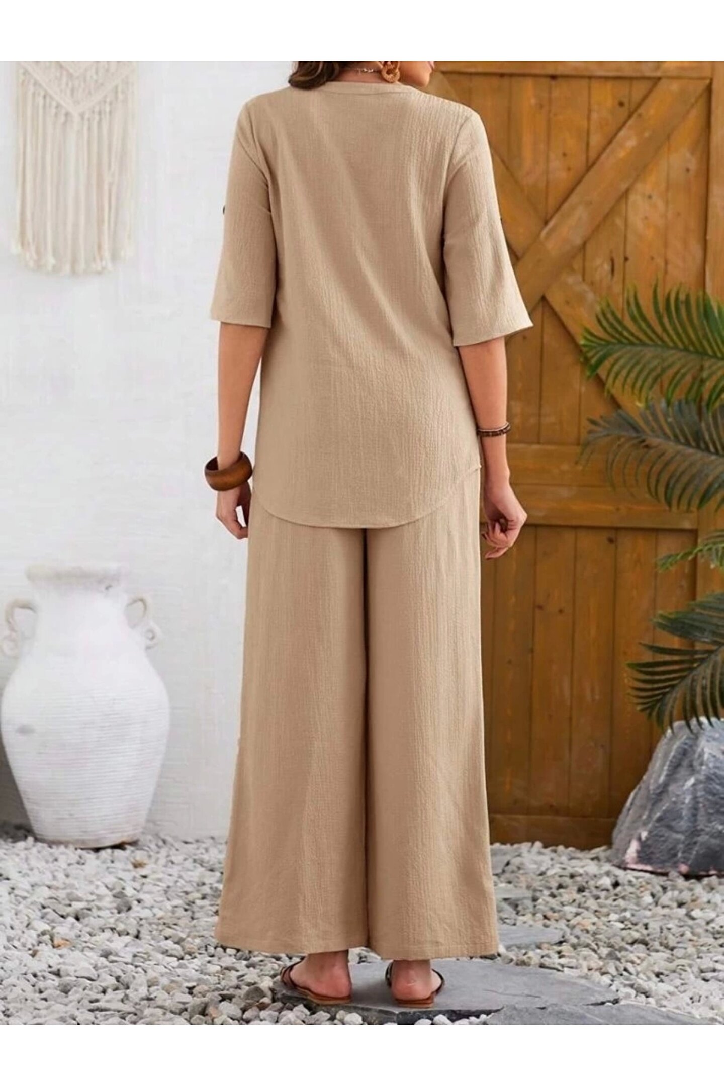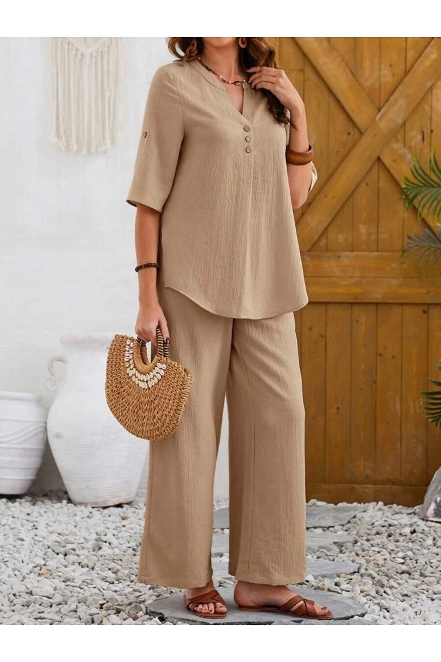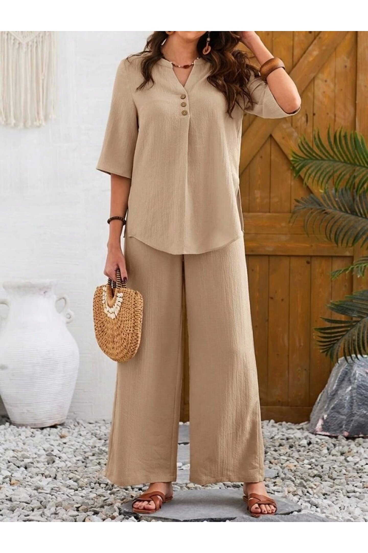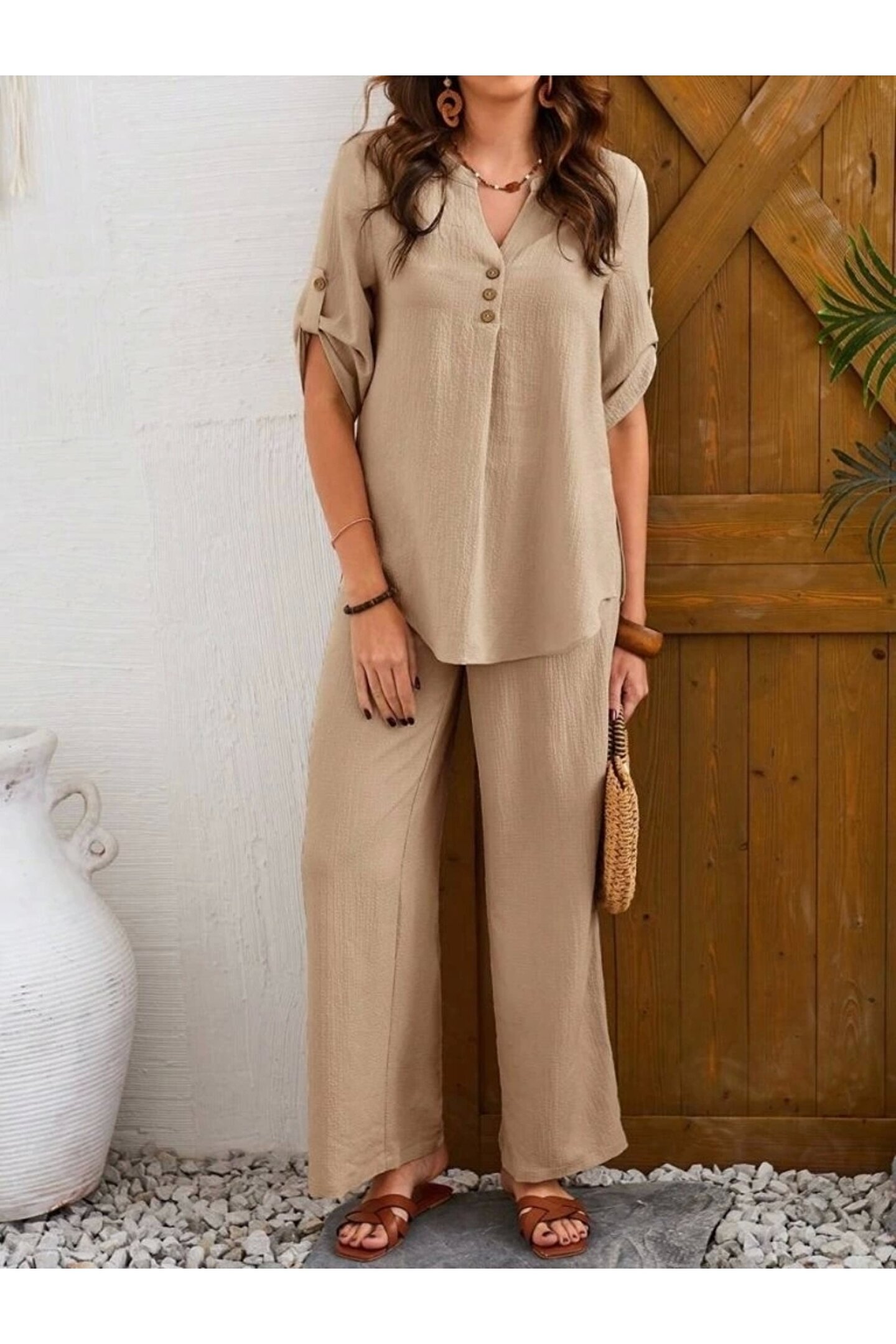 Kadın Kısa Kollu V Hakim Yaka Düğmeli Bürümcük Bluz Ve Pantolon Ikili Takım