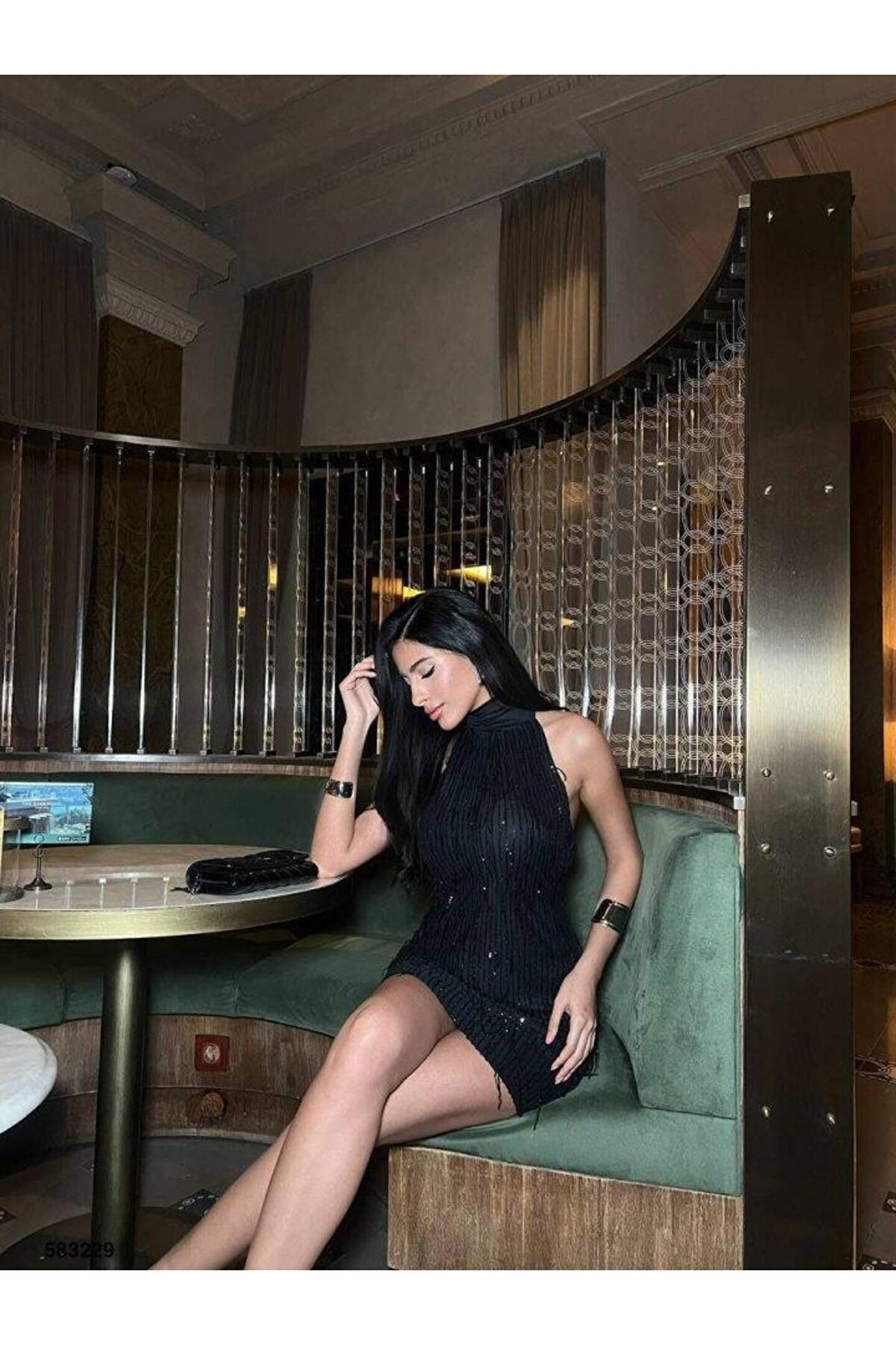 Kadın Pul Payet Kumaş Halter Yaka Mini Elbise