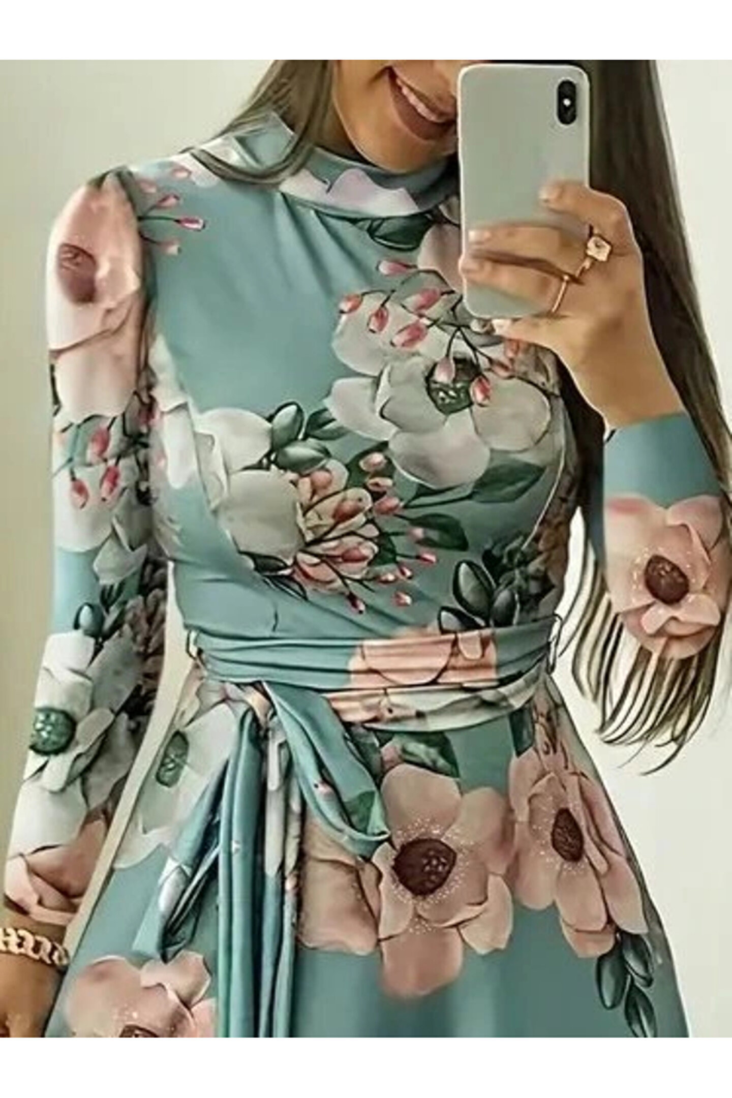 Kadın Uzun Kollu Yuvarlak Yakalı Beli Kuşaklı Desenli Süprem Uzun Elbise