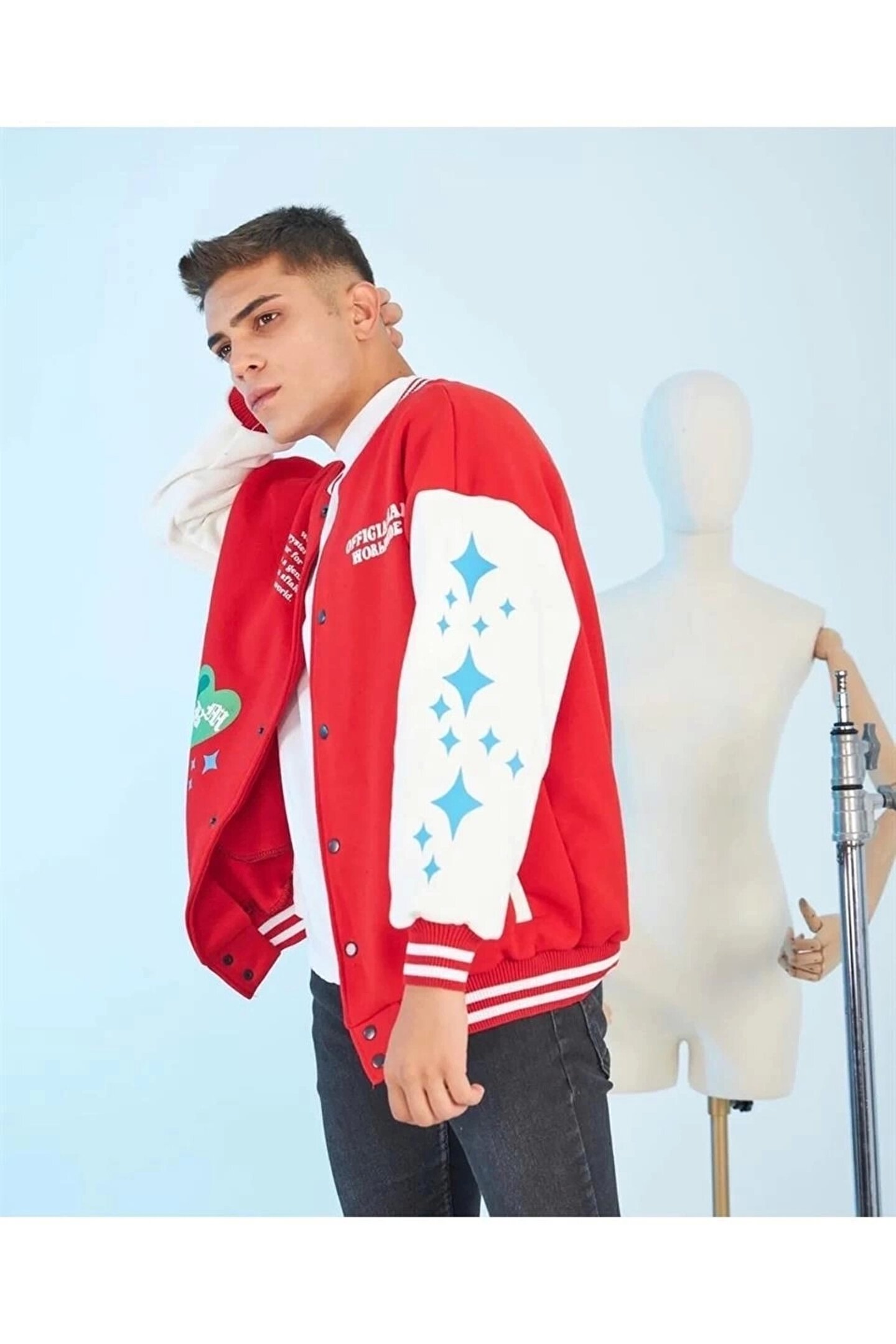 LUMİART Erkek Kolları Yıldız Sırt Baskılı Oversize Kolej Ceket - Kırmızı