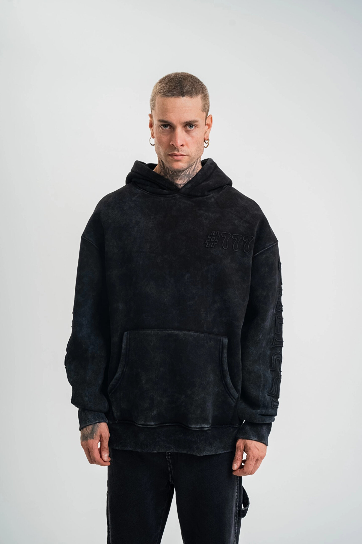 Unisex Uzun Kol Kapşonlu Yıkamalı Nakışlı SweatShirt - Siyah hediye paketi yapılabilir