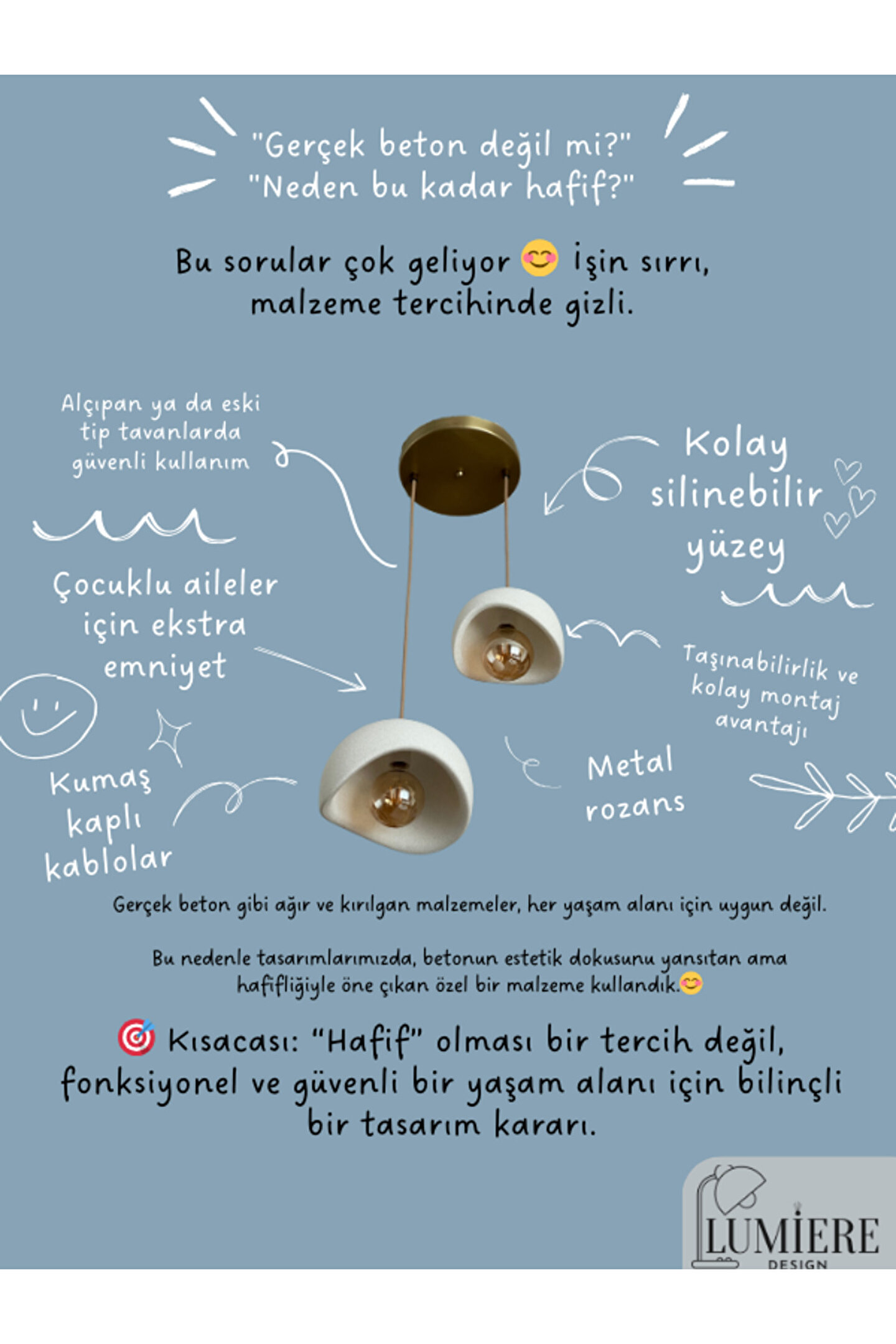 Beton Görünümlü İskandinav & Bohem Tarz 2’li Sarkıt Avize - Profesyonel Tasarım, Gün Işığı Rustik Ampul İçerir ⸻ Ürün Açıklaması Lumiere Design 2’li Beton Görünümlü Sarkıt Avize – Üst Düzey İşçilik, Şık ve Dayanıklı Tasarım Evinize modern, sofistike ve zarif bir dokunuş katacak Lumiere Design 2’li Beton Görünümlü Sarkıt Avize, kaliteli malzeme ve profesyonel işçilik ile üretilmiştir.; Hem dayanıklılığı hem de göz alıcı tasarımıyla yaşam alanlarınıza estetik bir hava katar.; ✅ Üst Düzey Kalite & Profesyonel İşçilik •Dayanıklı ve uzun ömürlü malzemeler kullanılarak üretilmiştir.; Beton veya seramik gibi hassas değildir; darbelere karşı dayanıklı sert plastik başlıklar sayesinde güvenle kullanılabilir.; • Metal rozans ve demir kablo sıkıştırıcı klipsler, ürüne hem şıklık hem de sağlamlık kazandırır.; •Kaliteli kumaş kaplı kablo, sadece işlevsellik değil, aynı zamanda tasarımda modern bir görünüm sağlar.; ✅ Öne Çıkan Teknik Detaylar •Başlık Çapları: 30 cm - 20 cm •Ağırlık: 2 - 2,5 kg •Ampuller: Gün ışığı rustik ampul ile gönderilir (E27 duy uyumlu).; •Kutu İçeriği: Montaj için gerekli vida ve dübeller dahildir.; •Kablo Uzunluğu: 1 metre olup, klipsleri serbest bırakarak uzatıp kısaltabilirsiniz ve istediğiniz yüksekliği kolayca ayarlayabilirsiniz.; •Anahtar Uyumluluğu: Tekli, ikili ve üçlü anahtarla kullanılabilir.; Ancak elektrik tesisatınızın uygun olup olmadığını kontrol etmeniz önerilir.; ✅ Kolay ve Güvenli Kurulum •Ürün hazır kurulu şekilde gelir, sadece bağlantıları yapmanız yeterlidir.; Bu sayede hızlı ve zahmetsiz bir montaj imkanı sunar.; •Elektrik bağlantısı ve anahtar sistemine uygun hale getirme işlemlerini mutlaka bir elektrikçiye yaptırın.; Kendi başınıza müdahale etmeniz güvenli olmayabilir.; ✅ Pratik Kullanım & Uzun Ömürlü Tasarım •Nemli bir bezle kolayca temizlenebilir.; •Özel tasarlanmış sağlam kutu içinde güvenle teslim edilir.; ✨ Renk ve Model Seçenekleri Lumiere Design mağazamızda tekli, çiftli ve üçlü modellerin yanı sıra beyaz ve eskitme renk seçenekleri de mevcuttur.; Dekorasyon tarzınıza en uygun modeli seçerek yaşam alanlarınıza zarif bir dokunuş katabilirsiniz!