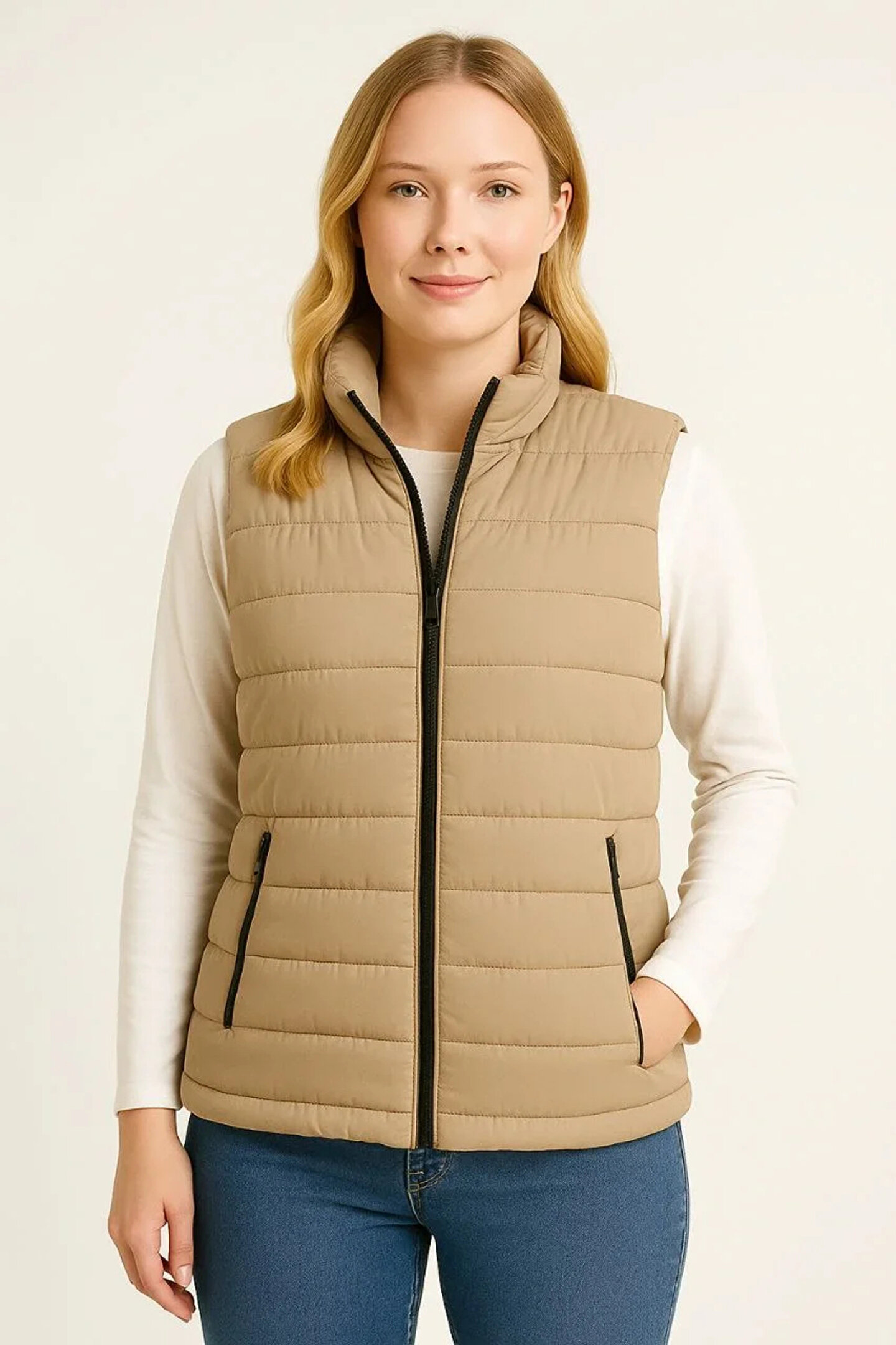 Erkek Şişme Fermuarlı Yelek Su itici Kapitone Astarlı Kumaş Cepli Hafif Kışlık Spor Rahat Kalıp -Bej