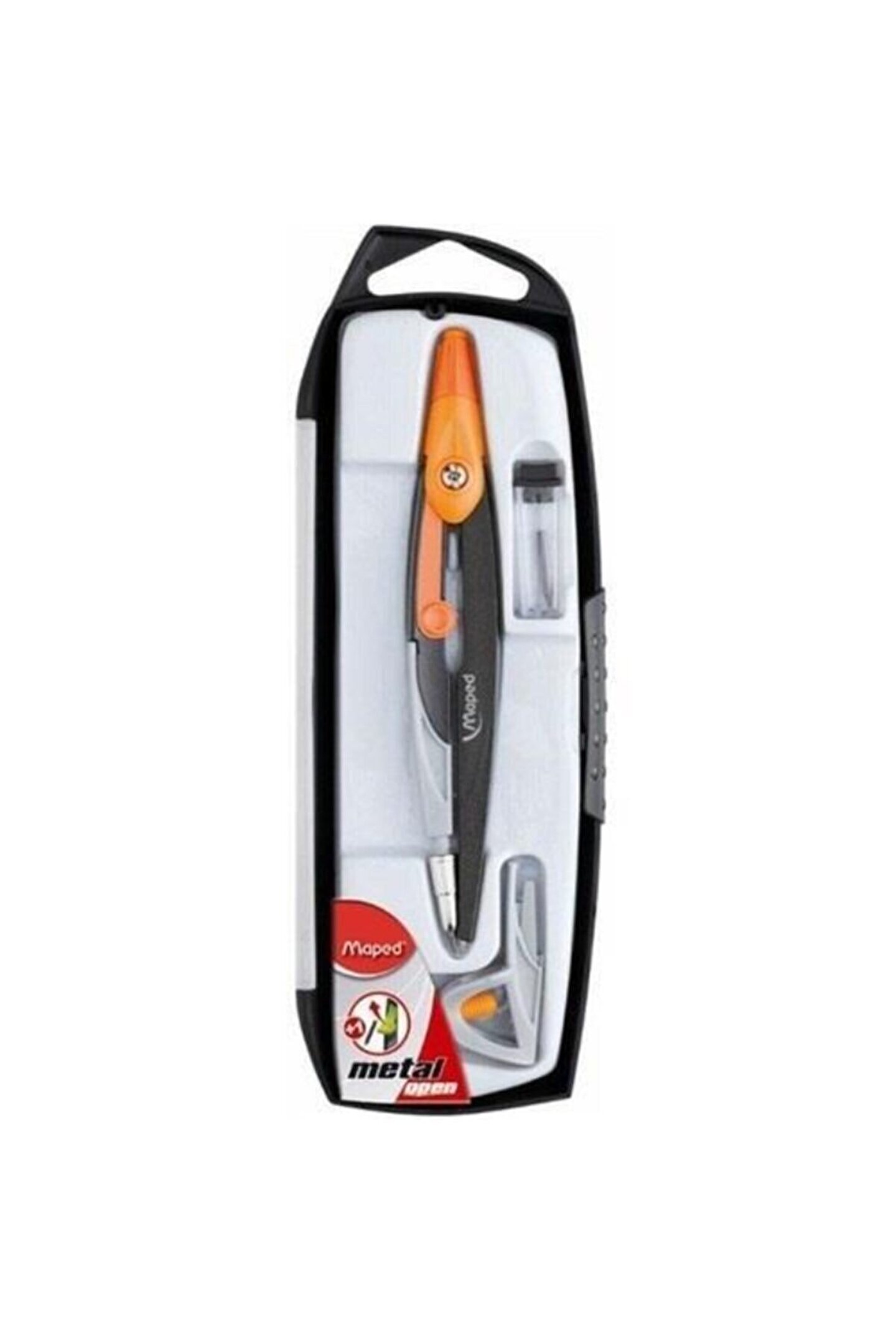 Darbeye karşı dayanıklı saklama kabı. 3 parçadan oluşur. Pergel, uç ve kurşun kaleme uygun uç. Pergel metal gövdeye sahip.