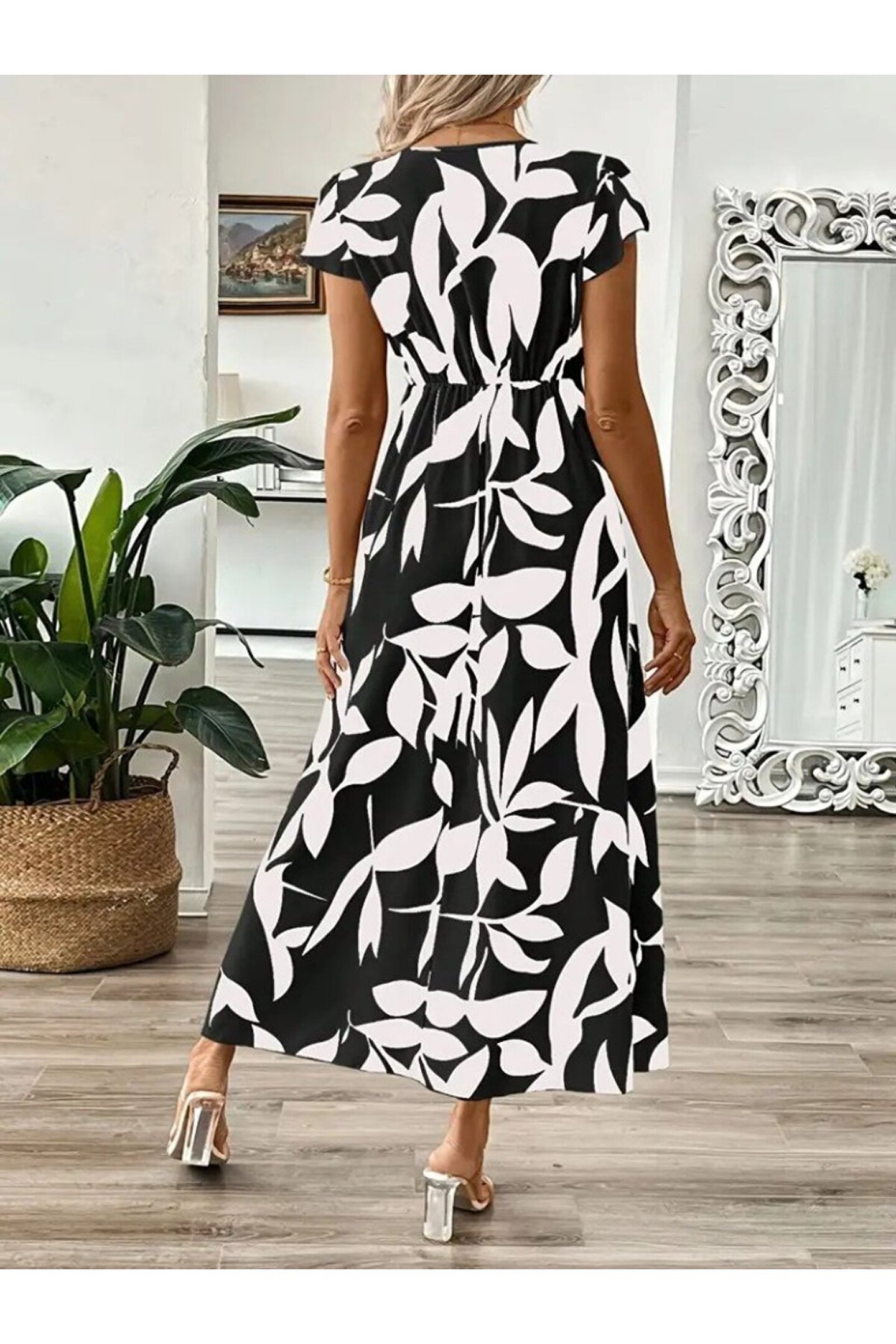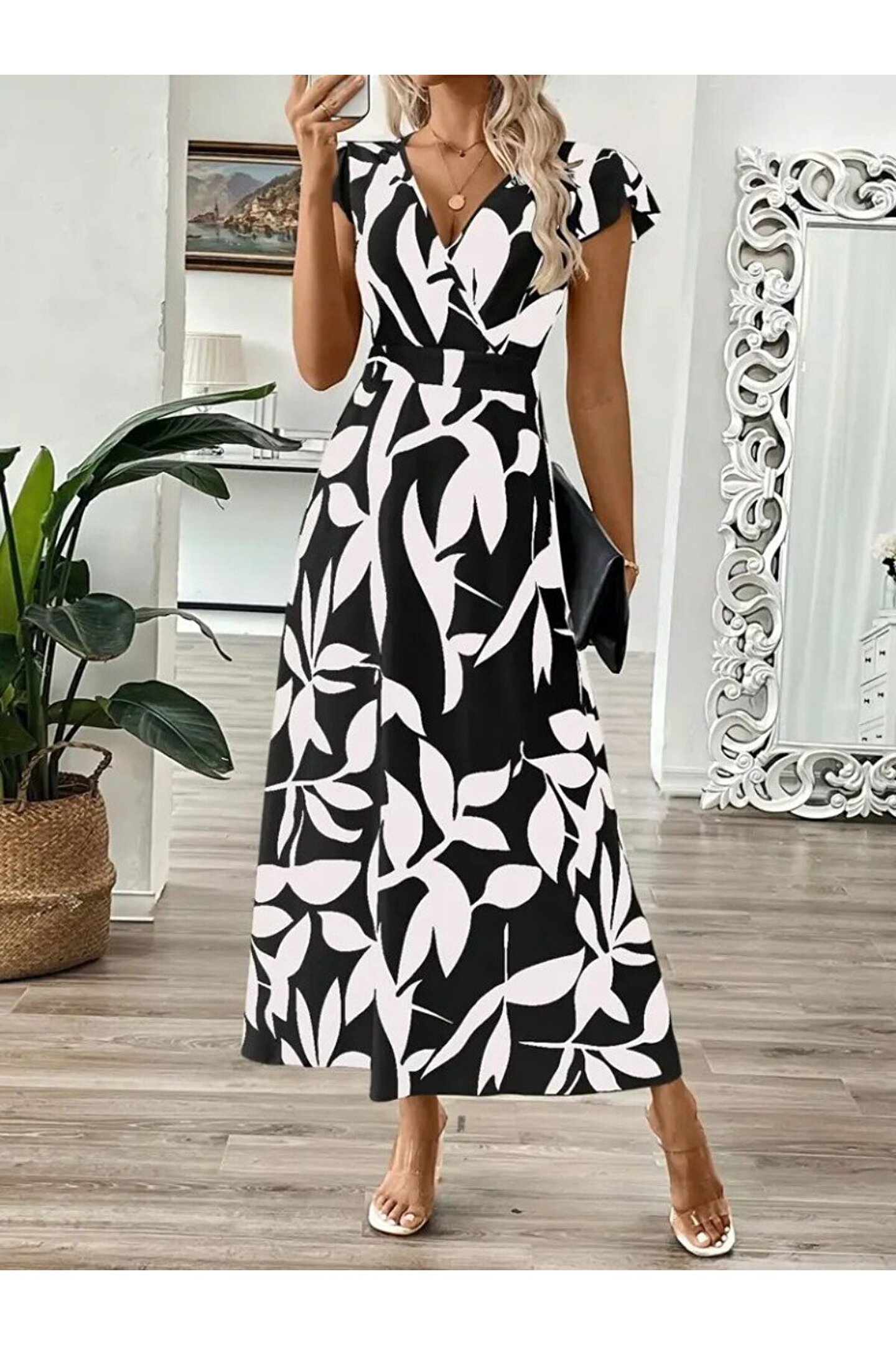 MAREANDPANDA Kadın Kısa Kelebek Kollu Kruvaze Yaka Desenli Süprem Elbise