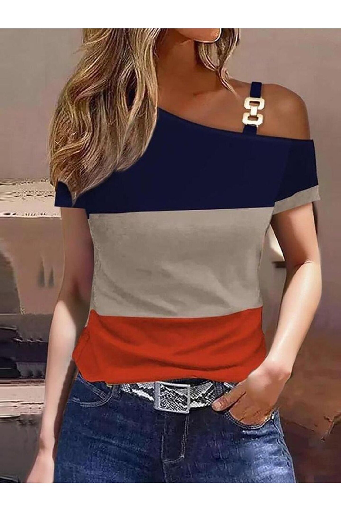 Kadın Kısa Kollu Tek Omuzu Açık Toka Detaylı çok Renkli Viskon Bluz