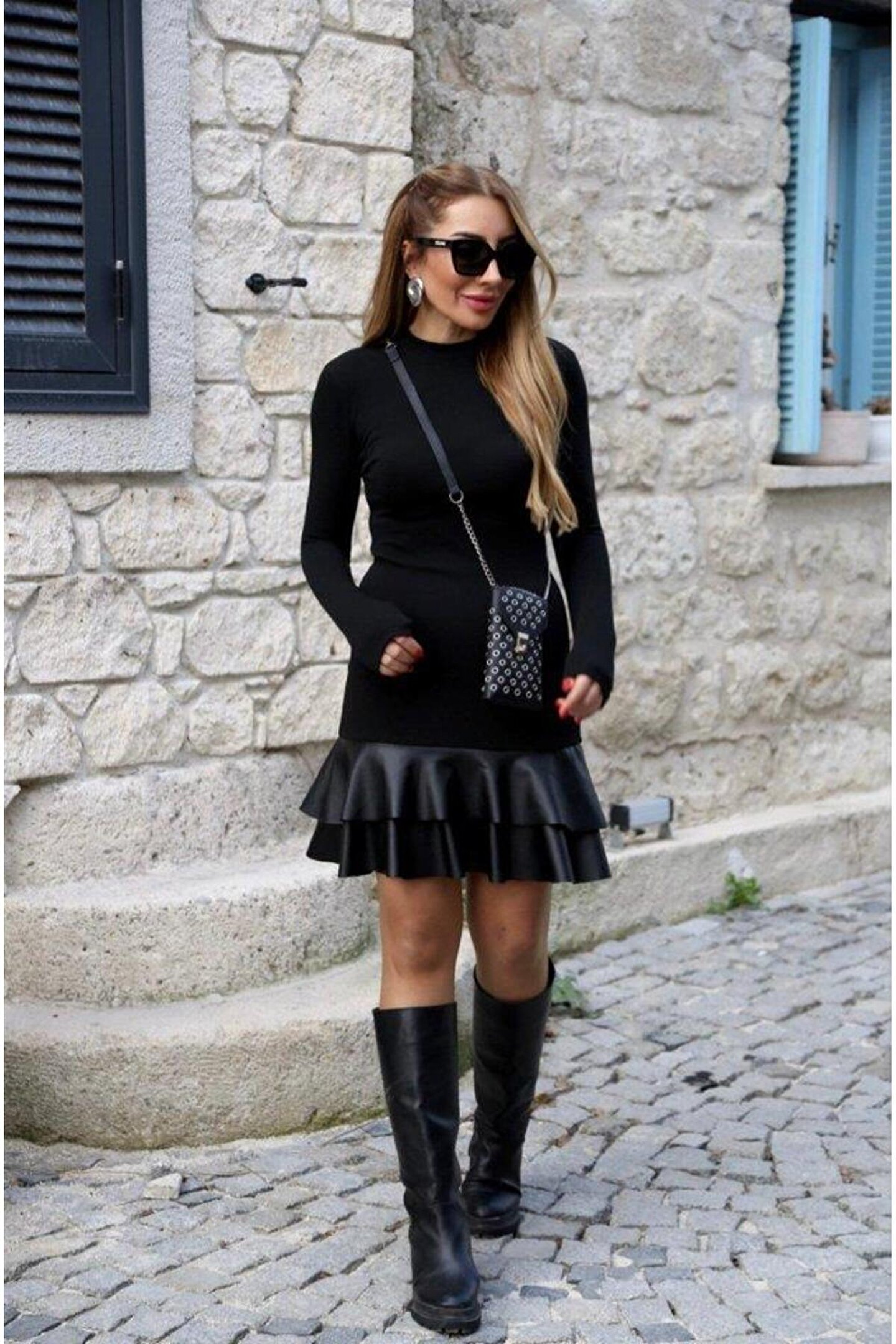 Kadın Uzun Kollu Bisiklet Yaka üst Viskon Etek Ucu Deri Kısa Elbise