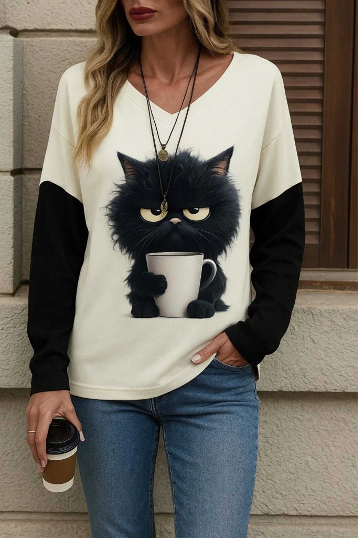 Kadın Uzun Kollu V Yakalı Kedi Baskılı şardonlu Dalgıç Bluz