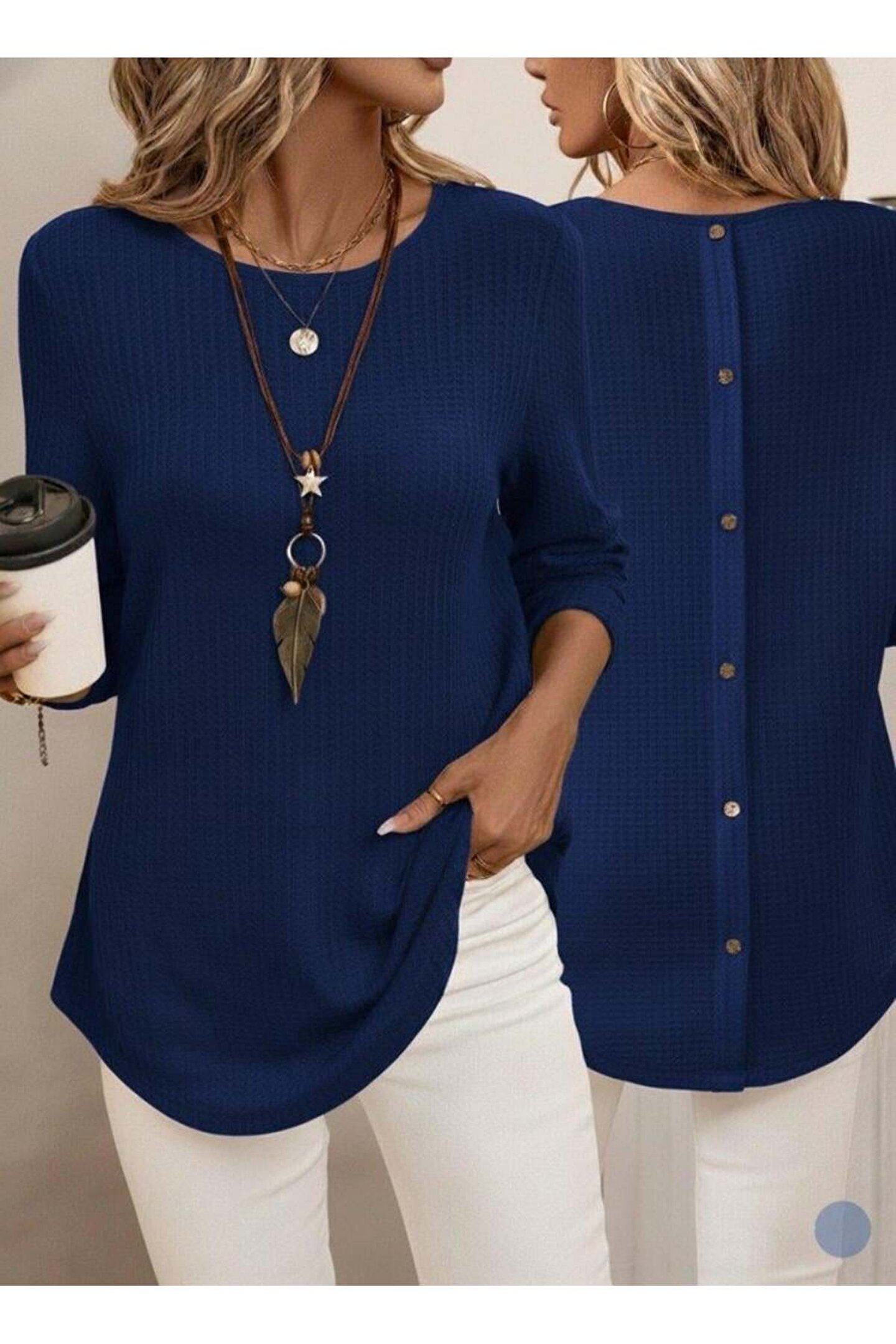 Kadın Uzun Kollu Yuvarlak Yaka Arkadan Düğmeli Waffle Bluz