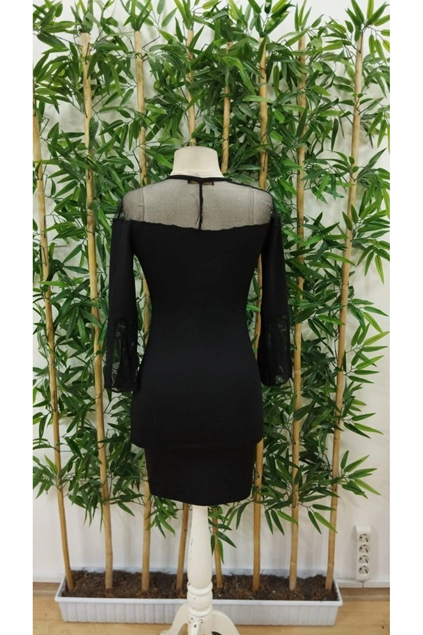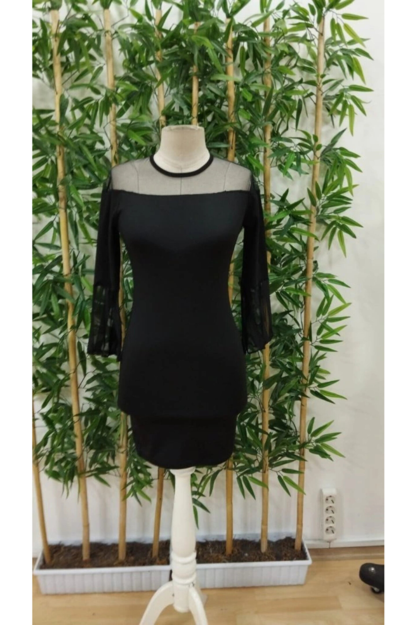 Kadın Uzun şeffaf şerit Kollu Madonna Yaka Vücudu Saran Dalgıç Kısa Elbise
