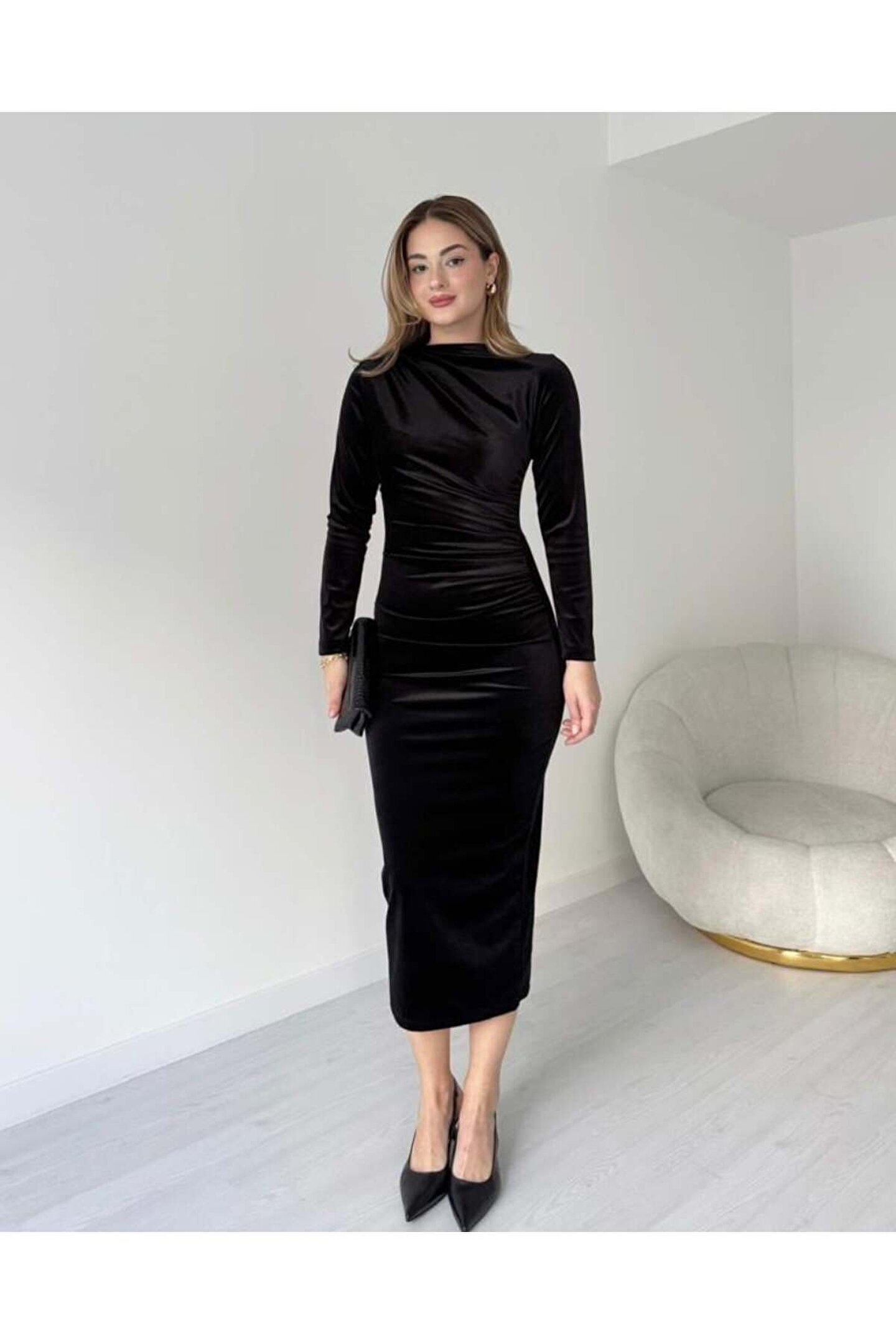 Siyah Uzun Kollu Büzgü Detay Kadife Kumaş Midi Boy Elbise.; Ürün detayları ve kullanım hissi kişisel tercihlere göre değişiklik gösterebilir.