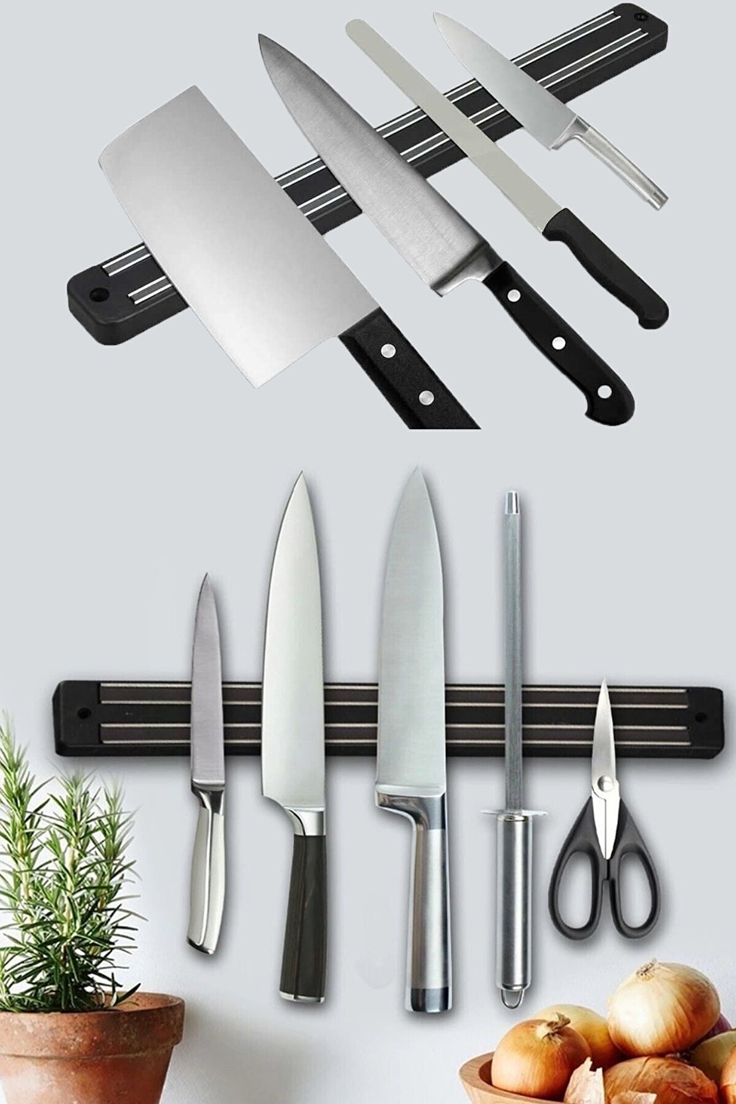 Mıknatıslı bıçak tutucu ile bıçaklarınızı duvara asabilir ve mutfağınızda kullanışlılığı arttırabilirsiniz; Paket içinden çıkan vidalarla ürünü kolayca mutfağınızın istediğiniz köşesine monte edebilirsiniz; Ardından üzerine istediğiniz düzende bıçaklarınızı ve diğer metal mutfak eşyalarınızı yapıştırabilirsiniz; Duvarda oldukça şık bir görüntü oluşturabilir ve tüm mutfak aletlerinizi elinizin altında bulunmasını sağlayabilirsiniz; Güçlü manyetik çekimi sayesinde tüm mutfak gereçlerinizi üzerine yerleştirebilirsiniz; Mutfakta, bıçaklarımız hep elimizin altında olsun istiyoruz ama bir taraftan da tehlikeli olduğu için saklamak istiyoruz; Hele evde çocuk varsa saklamak için farklı farklı yerler arıyoruz; Işte bu duruma bu ürün süper kurtarıcınız oluyor; Bu mıknatıslı bıçak tutucu sayesinde bıçaklar hem istediğimiz zaman elimizin altında oluyor hemde güvenli oluyor; Ürün ölçüsü: 55 cm Paket içeriği: 1 adet mıknatıslı bıçak tutucu 2 adet vida ;;