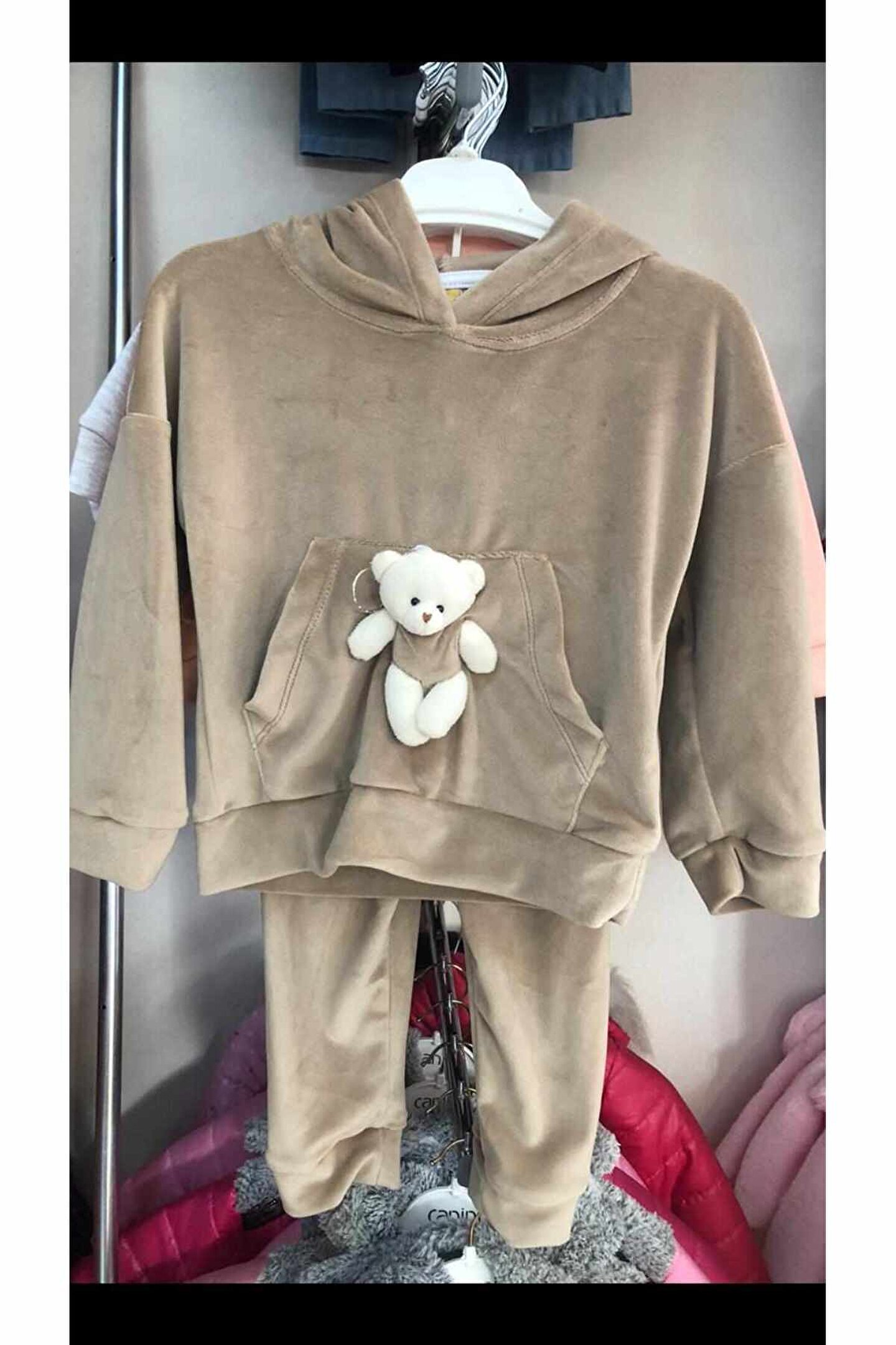 Mavera Kahverengi Kadife kanguru Cepli Ayıcıklı Kapüşonlu Takım