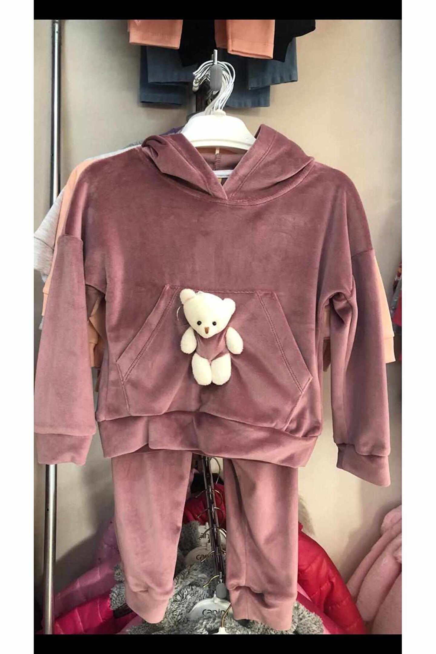 Mavera Koyu Mor Kadife kanguru Cepli Ayıcıklı Kapşonlu Takım