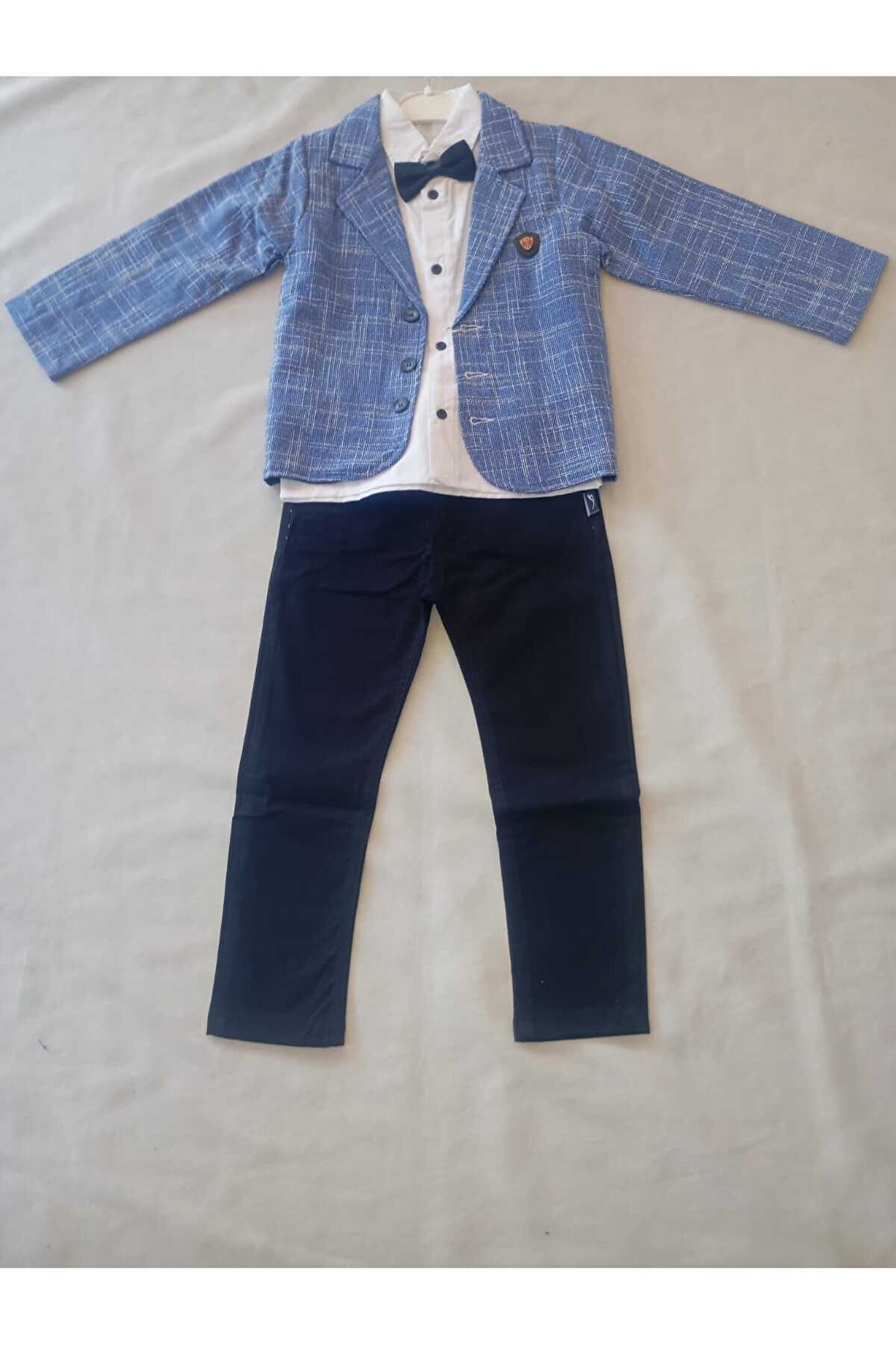 Her yaştan çocuğunuz için uygun, rahat ve şık tasarımıyla dikkat çeken mavi beyaz gömlekli papyonlu lacivert kotlu takım elbise.; Denim kumaşı sayesinde dayanıklı ve uzun süreli kullanım imkanı sunar, aynı zamanda kolay bakım avantajına sahiptir.; Oversize silueti ile modern ve trend bir görünüm kazandırırken, rahat hareket etme özgürlüğü sağlar.; Çocukların özgürce hareket edebilmesi için regular boy kesimi ile konforlu bir kullanım sunar.; Çizgili deseniyle klasik ve zamansız bir stil oluşturarak her ortamda dikkat çekici bir duruş sergiler.;