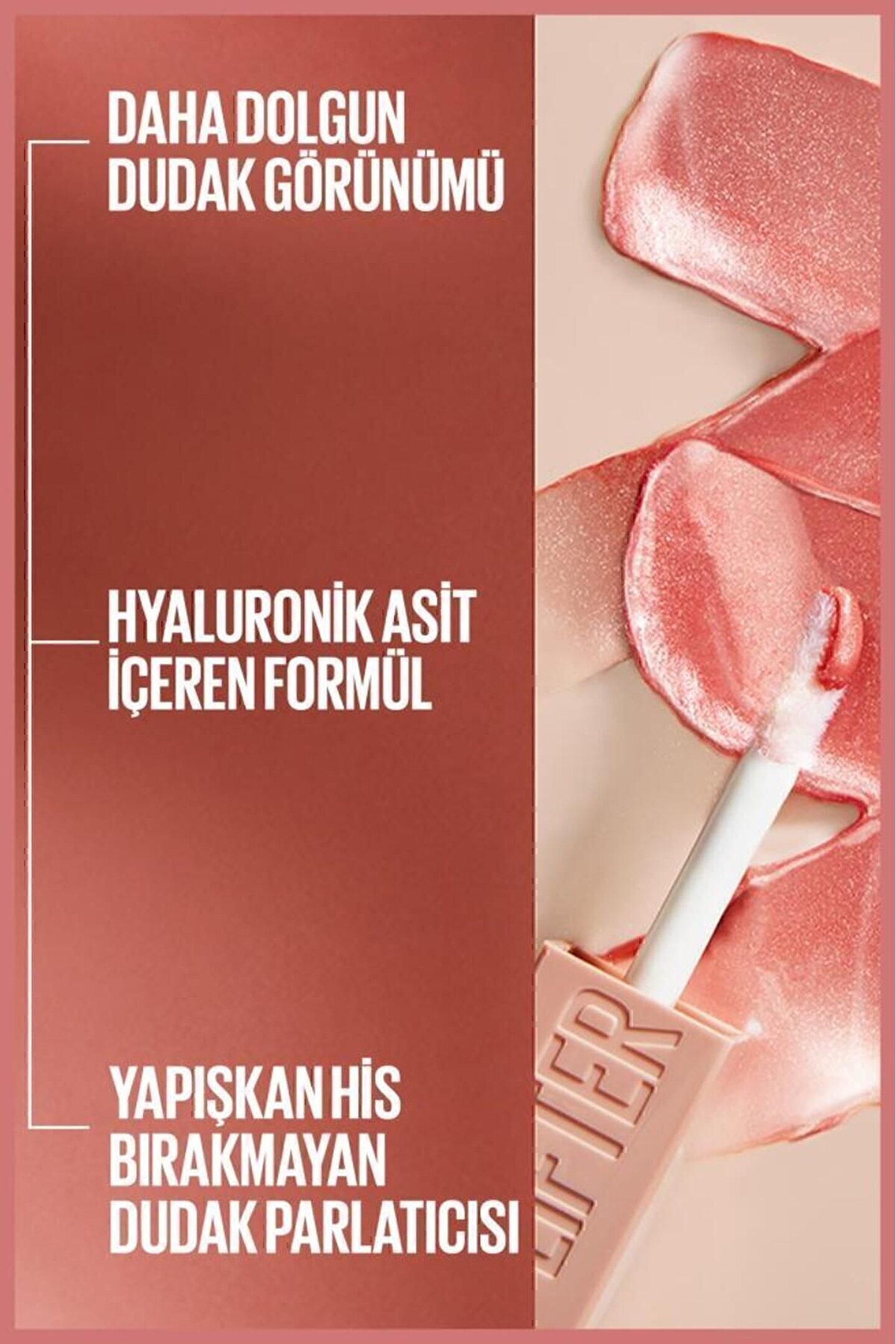 Hyaluronik asit içeren nemlendirici dudak parlatıcısı! Dudaklara daha kalkık ve dolgun görünüm Gözle görünür şekilde pürüzsüz görünen dudaklar Yapışkan his bırakmayan formül Dudaklarda lifting etkisi