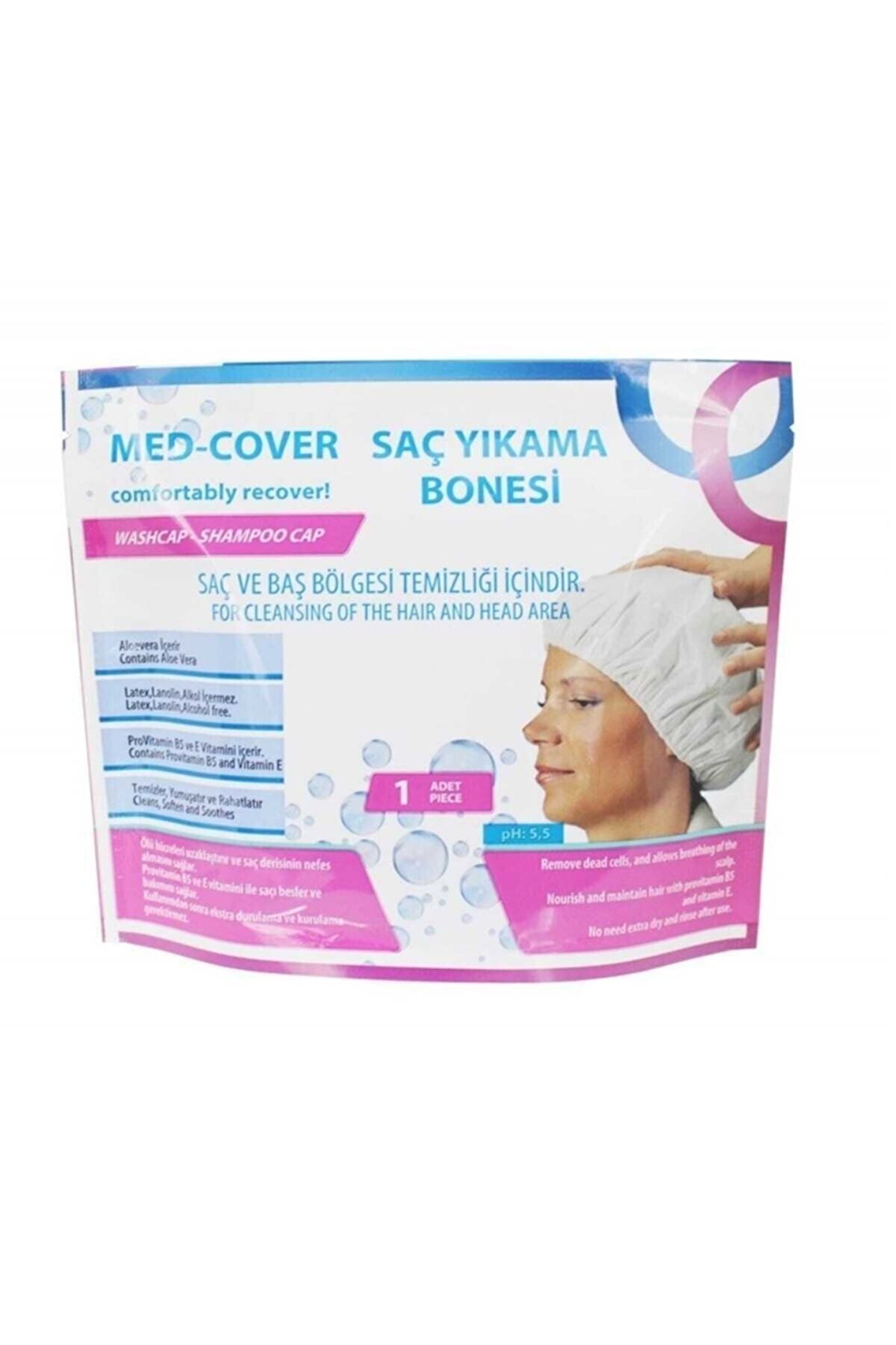 Saç Yıkama Bonesi 1 Adet ; Normal yollar ile saç ve baş bölgesi temizliği yapılamayan durumlarda kullanılır.; Bone şeklinde tasarlanmış olan ürün dış yüzeyi su geçirmeyen özel bir kumaştan imal edilmiştir.; Lateks içermeyen özel lastiği ile kafaya takılabilir ve saçı komple kavrayabilir.; Lateks içermediği için ciltte tahrişe sebep olmamaktadır.; İç katmanda bulunan özel kompozisyonu sayesinde yüksek emiciliğe sahip olan nonwoven kumaşa emdirilmiş zenginleştirilmiş solüsyon ile günlük saç temizliği ve bakımı yapılabilmektedir.; Sonrasında durulama ve kurulama gerektirmemektedir.; Sıvı geçirmeyen dış katmanı sayesinde sıvının dış yüzey ile temasını önler.; Tek yapılması gereken paketi açmak, boneyi tüm saçı kaplayacak şekilde kafaya takmak ve 3 dakika boyunca freksiyon şeklinde masaj yapmaktır.; MED-COVER Saç Yıkama Bonesi, Saçı kirden yağdan arındırır, hoş kokmasını sağlar, saç derisini yumuşatır ve besler, saçlara bakım yapar.; İçeriğindeki Allantoin ile saç derisindeki ölü hücreleri ciltten uzaklaştırır.; Normal yollar ile yapılan saç temizleme işleminde saçtaki ve saç derisindeki kir ve yağ gibi rahatsız edici etkenler köpük vasıtası ile uzaklaştırılır.; MED-COVER Saç Yıkama Bonesi ürününde yüksek emiciliğe sahip nonwoven kumaş bu görevi üstlenir.
