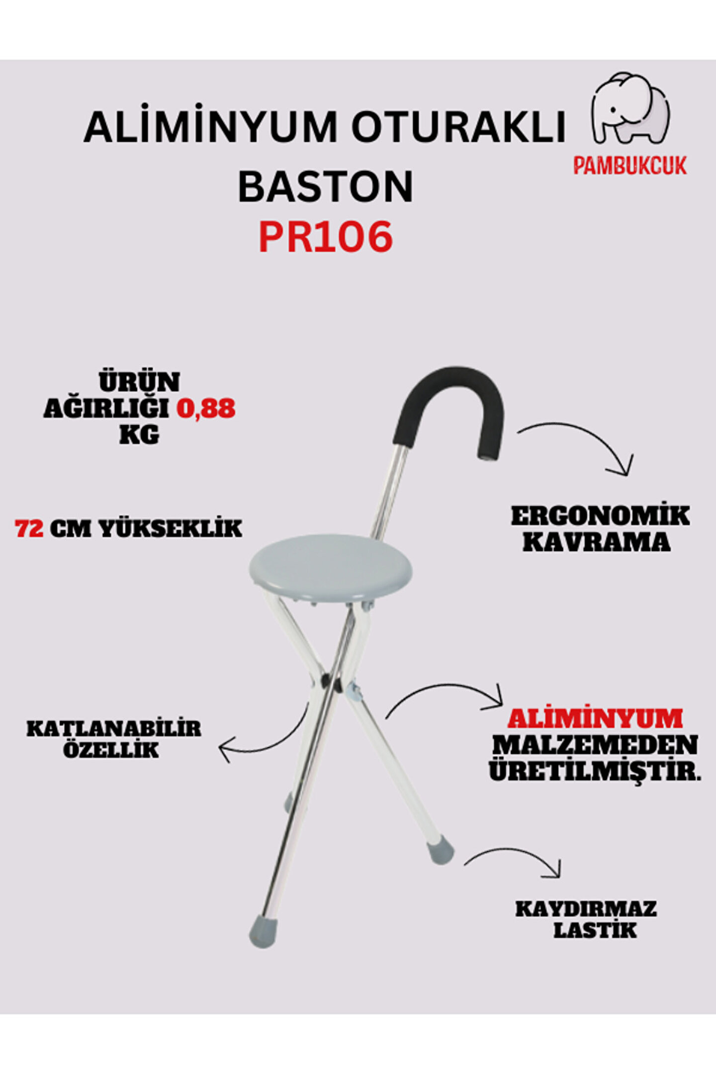 Alüminyum oturaklı baston genel bakış: Yürüme güçlüğü çeken, yaşlı ve engelliler için tasarlanmış baston rahat baston modeli, tekerlekleri kauçuk lastik olduğu için kaydırmaz oturaklı baston katlanabilir özelliktedir bu nedenle de taşınması kolaydır kullanıcı kişi yorulduğunda bastonu tabure haline getirir, oturur ve dinlenebilir genel özellikler: Katlanabilir özelliktedir el tutma yerleri anatomiktir alüminyum oturaklı baston modeli 3 ayaklı alüminyum oturaklı baston lastikleri kauçuktan yapılmıştır ithal bir üründür; ;;
