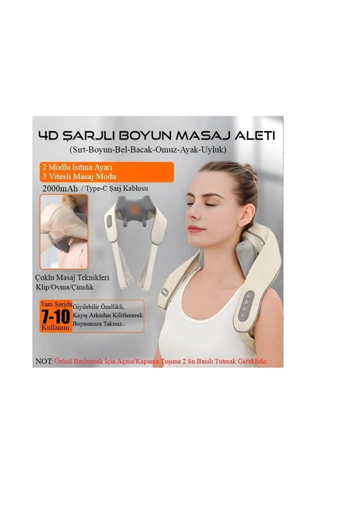 NOT ÜRÜNÜ İLK ÖNCE YEŞİL IŞIK YANANA KADAR ŞARJ EDİNİZ SONRA POWER DÜĞMESİNE BASILI TUTARAK ÇALIŞTIRINIZ Ürünü başlatmak için Açma/Kapama tuşuna 2 sn basılı tutulması gerekmektedir. ; Parmak ovmalı masaj aleti el masajı etkisini vererek normal masaj yaptırıyor gibi hissettirir. ; Farklı yaş ve yorgunluk seviyesindeki insanlar için 2 masaj modu 2 yoğunluk modu ve ısıtma moduna sahiptir. ; Giyilebilir özelliği sayesinde kayışını arkadan kilitleyerek boynunuza takın. ; Parmak ovmalı masaj aleti ile masaj süresi boyunca ellerinizi serbest bırakın mükemmel masajın keyfini çıkarın. ; Ayarlanabilir askıları ile tüm vücut bedenleri ile uyumludur. ; 2 farklı ısıtma modu ile ağrı yaşanan bölgeyi ve kulunçlarınızı yumuşatır. ; Ürün yeniden şarj edilebilir. Herhangi bir kablo ile bağlantınız olmaz. ; 1 * Ana Makine 1 * Şarj Kablosu 1 * Manuel