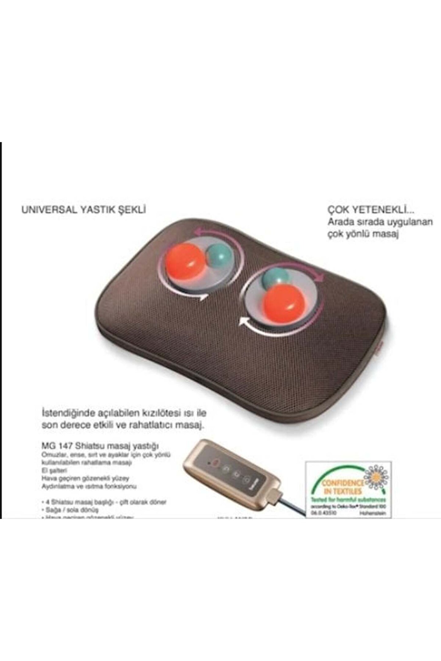 Boyun Masaj Aleti Boyun Masaj Aleti Beurer MG 147 Shiatsu masaj yastığı ? Omuzlar, ense, sırt ve ayaklar için çok yönlü kullanılabilen rahatlama masajı ? El şalteri ? Hava geçiren gözenekli yüzey ? Aydınlatma ve ısıtma fonksiyonu • 4 Shiatsu masaj başlığı; çift olarak döner • Sağa / sola dönüş • Hava geçiren gözenekli yüzey • Çıkartılabilen ve makinede yıkanabilen kılıf • Büyük ve üniversal yastık şekli sayesinde çok yönlü kullanılabilir • El şalteri ile kolay kumanda • Sabitleme için kenetlenen bant • Ölçüler: G x Y x D: 40 x 27 x 12 cm • 12 Watt;