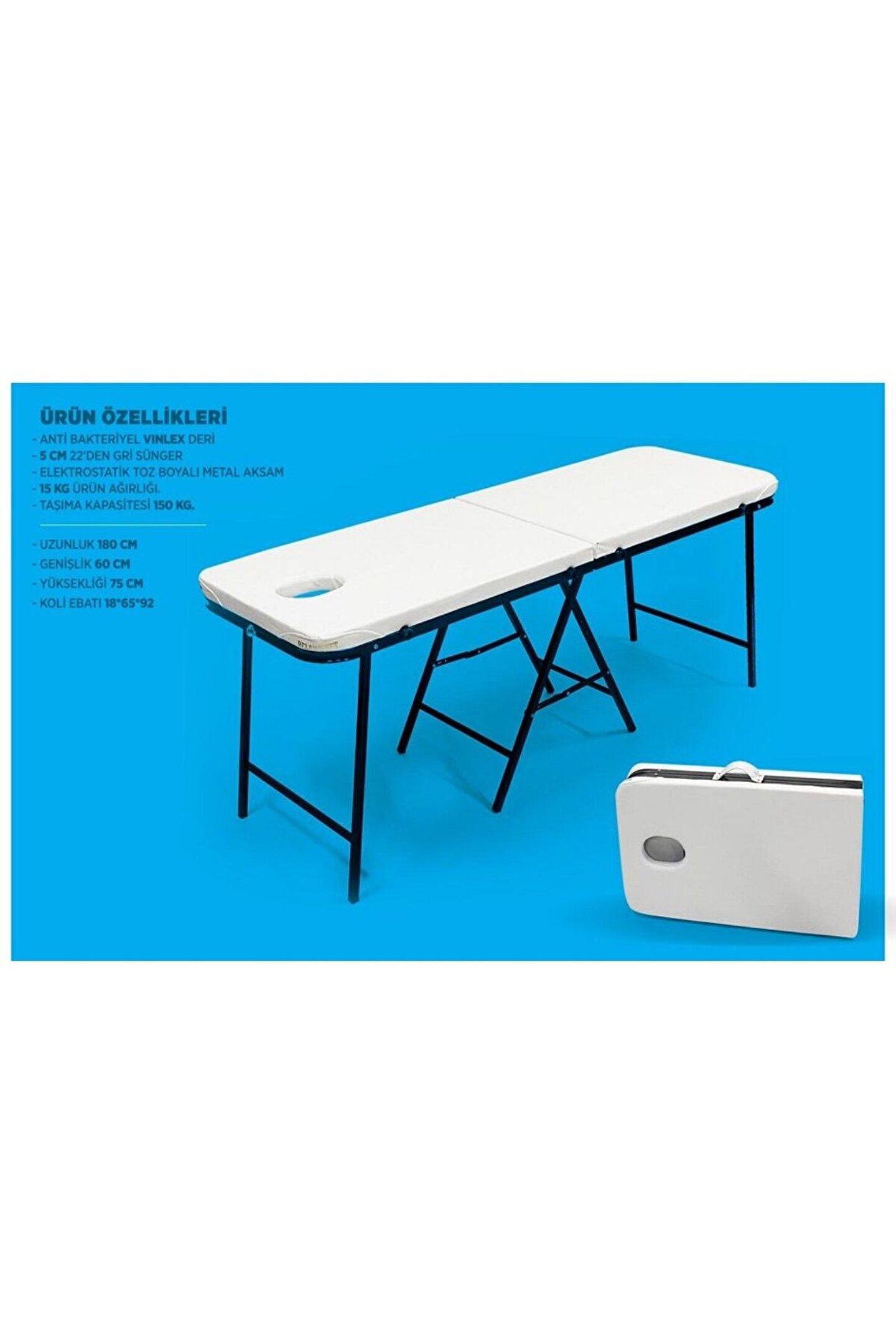 28 dansite gri sünger ve iyi kalite vinlex siyah deri ile kaplanmıştır. Platformun baş kısmındaki delik sayesinde yüzüstü yatış pozisyonlarında kolaylık sağlar. Masa çanta pozisyonuna getirilerek kolayca taşınabilir. Tüm metal aksam elektrostatik toz boyadır. *Ebat:180x60x75 cm *Ağırlık: 18 kg *Taşıma kapasitesi: 140 kg . Katlanır Çanta Tipi Masaj Masası Rahatlıkla katlanıp çanta tipini alan masaj masası Yatak platformu formika üzeri yüksek