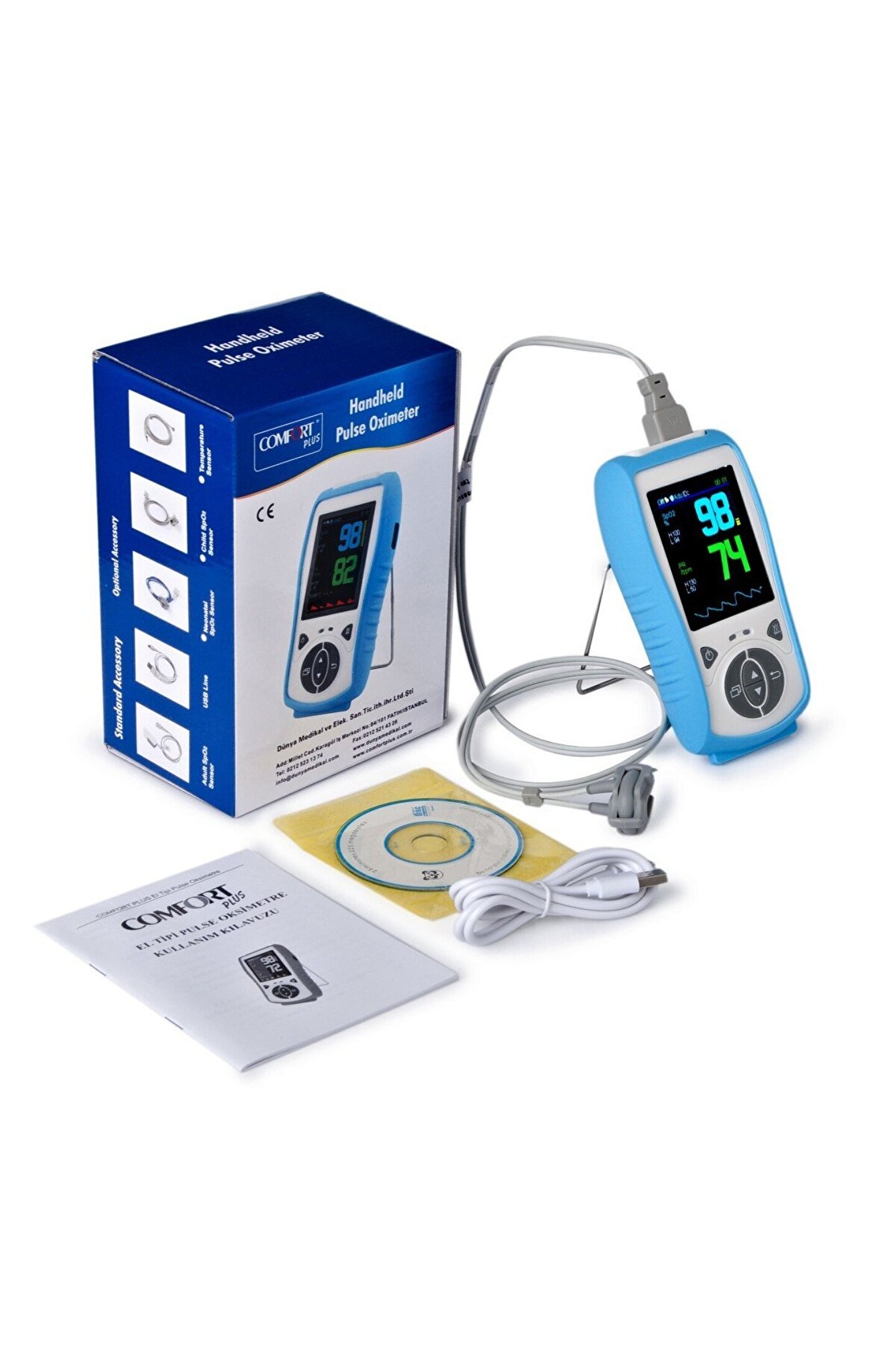 <h2>Comfort Plus El Tipi Yenidoğan Pulseoksimtre (Hem Pilli Hem Şarjlı)</h2>1-Taşımak için Hafif ve Kullanımı Kolay 2-Masa Kullanımı için Silikon Kauçuk Kaplama Koruması ve Stantlık 3-Nellcor Spo2 Sensorü İle Uyumludur. 4-Yetişkin,Yeni Doğan,Çocuk (problarını destekler) 5- Büyük LCD Ekran 2.8 inç 6-Sinyal olmadığında Otomatik Kapanma 7-360 saate kadar hafıza 8-Usb Kablosu ile Verileri Bilgisayara Aktarır 9- 4 x AAA 1.5V Alkalinli Pil ve Şarj Edilebilir Lityum Pil 10-Ayarlanabilir Menu (Alarm Özelliği)