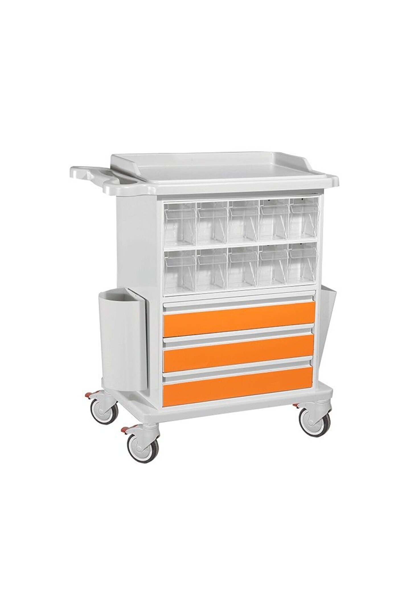 E-258 İlaç ve Pansuman Arabası Metal sac gövde üzeri elektrostatik toz boya ABS antistatik ikisi frenli dört adet teker ABS üst tezgah Dosyalık ve çöp kutusu 20 adet şeffaf ilaç kutuları Üç adet çekmece İtme kolu Boyut 50 x 90 x 110 cm Ağırlık 47 Kg;