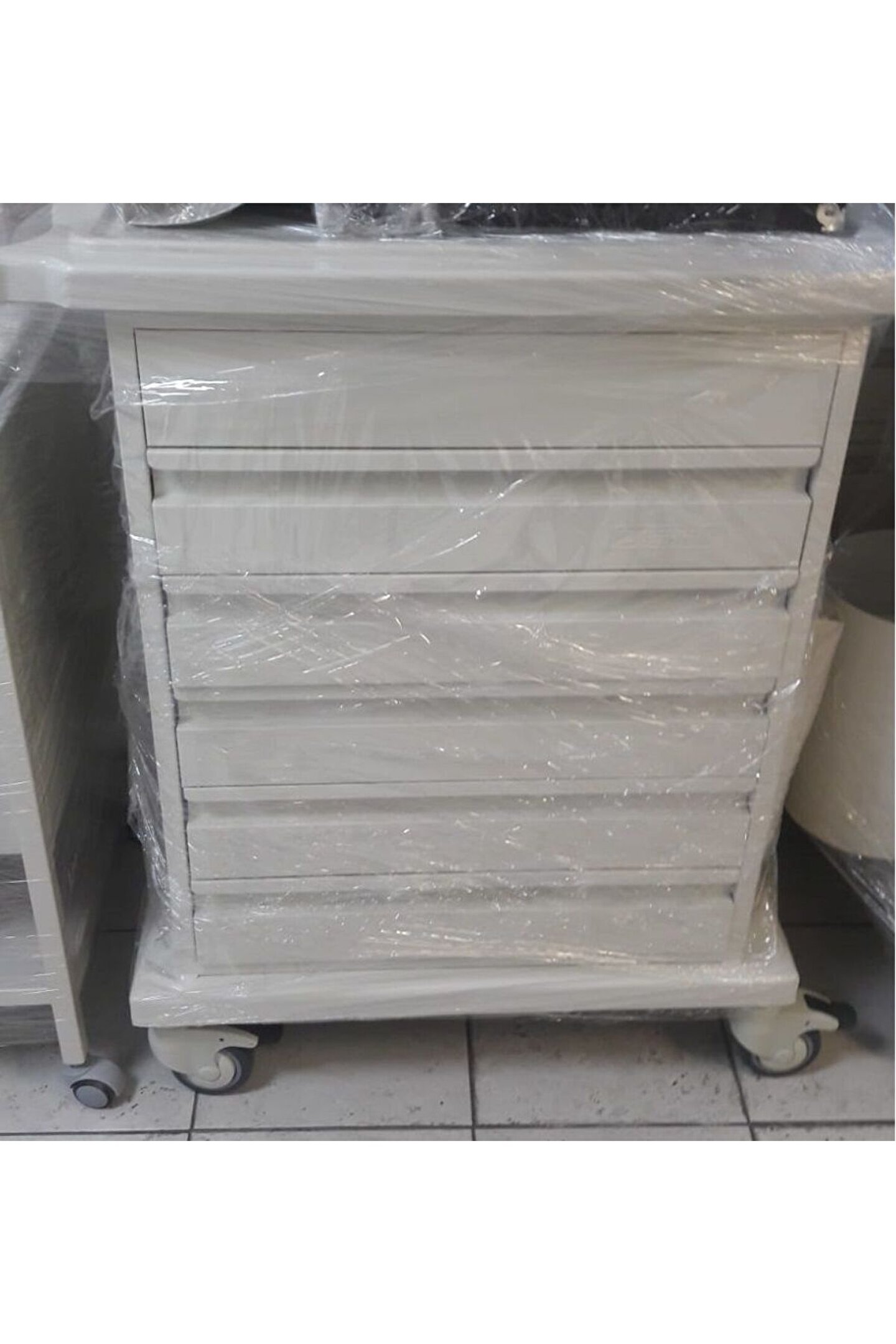 E-260 Acil Pansuman Arabası Beş Çekmeceli Metal sac gövde üzeri elektrostatik toz boya ABS antistatik ikisi frenli dört adet teker ABS üst tezgah Dosyalık ve çöp kutusu Beş adet çekmece İtme kolu Boyut 50 x 90 x 110 cm Ağırlık 55 Kg;