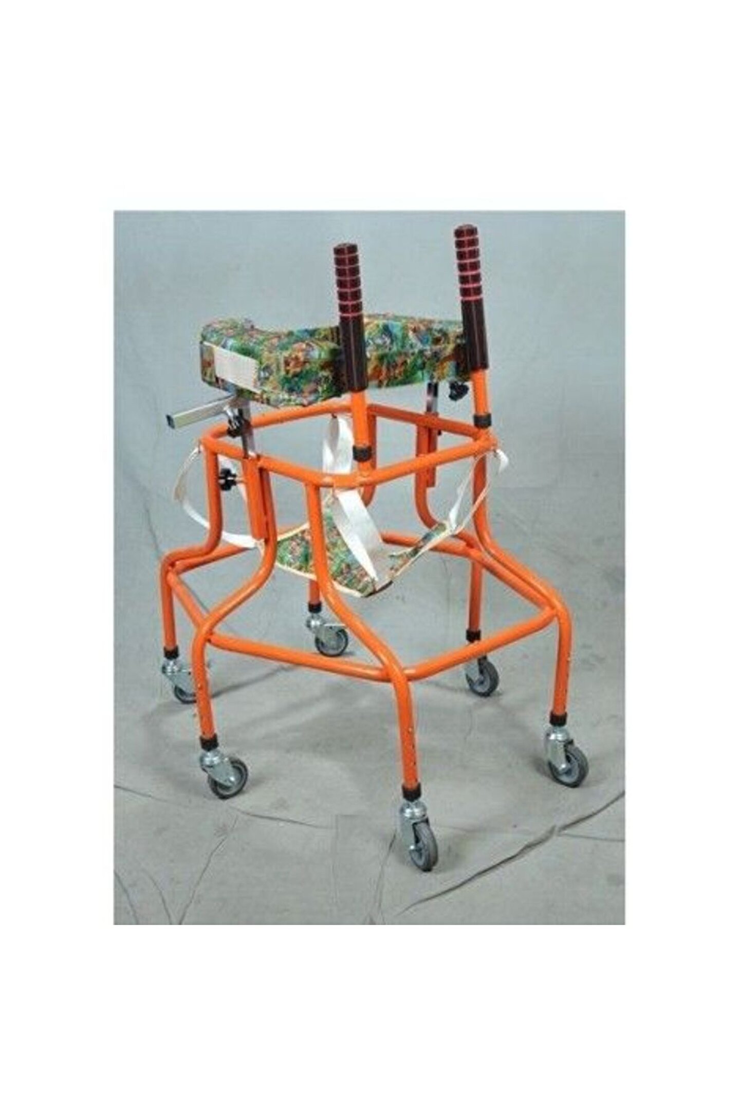 ELEKTROSTATİK TOZ BOYALI 6 tekerlekli yürüteç 02 , 15 yaş arası engelli çocuk hastaların yürüme kabiliyetlerini ve enerji depolarını boşaltmak için tasarlanmış üründür.bu ürünü kullanan çocukların kemik gelişimi sağlam ve ayakları üstüne düz ve sağlam basabilme direncini geliştirir. Cihaz sayesin çocuğun gelişen kemikleri direnç kazanır, gelişimi ve vucut yapısı direnç kazanır,cihazın içine koyulan çocuğun önce emniyeti alınır ayaklarının arasından geçirilen aparatla ayakları yere bastırılır kolları koltuk altından cihazın kol koyulan mekanizmanın üstüne otutturulur ve hasta kendi başına bırakılır. Hasta sağa sola yürüyerek dengeli olarak hareket eder cihazın hareket ederken hastayı devirmemesi için cihazın altı adet geniş örümcek ayağı gibi ayakları olmasından dolayı her hangi bir yere çarpmasından hastanın göreceği zararı engeller hasta sağa sola savrulmaz içinde rahat eder emniyetli olarak kullanır,cihaz tekerlek sistemli olup altı adet tekerleği mevcuttur hafif bir üründür .Yavrumuzun kasılması ve kendini atması varsa tavsiye edilmez Hastanın boyuna göre ayarlanır, yükseltilir ve alçaltılır, cihazın doksan derece hareket etme kabiliyeti mevcuttur, tekerlekli sandalye gibi Taşıma ürünü değildir.Yavrumuz kanepeye koltuğa tutunarak duvara yaslanarak ayakta duruyor ve adım atıyorsa ve velisi kendi parmaklarına yavrumuzun tutunarak ayakta tutup yürütebiliyorsa bu ürün önerilebilir.Tavsiye edilebilir. engelli örümcek yürüteci hastanın hareket etme kabiliyetini yürüme refleksi kazanmasını sağlar bu sayede hasta gelişimini en düşük seviyede felç rahatsızlığıyla geçirir fizik tedavi doktorları tarafından tercih edilen bir üründür ,hasta için her türlü kolaylık cihazda düşünülmüştür.Cihazın herhangi bir bakımı yoktur yerli imalat olarak üretilmektedir, aksesuarlarında herhangi bir zarar veya kaybolma olasığı olursa yedek malzeme sorunu yoktur. Üretim hatasına karşı karsı garantilidir .engelli örümcek yürüteçengelli yürüteç çeşitleri engelli yürüteç itler