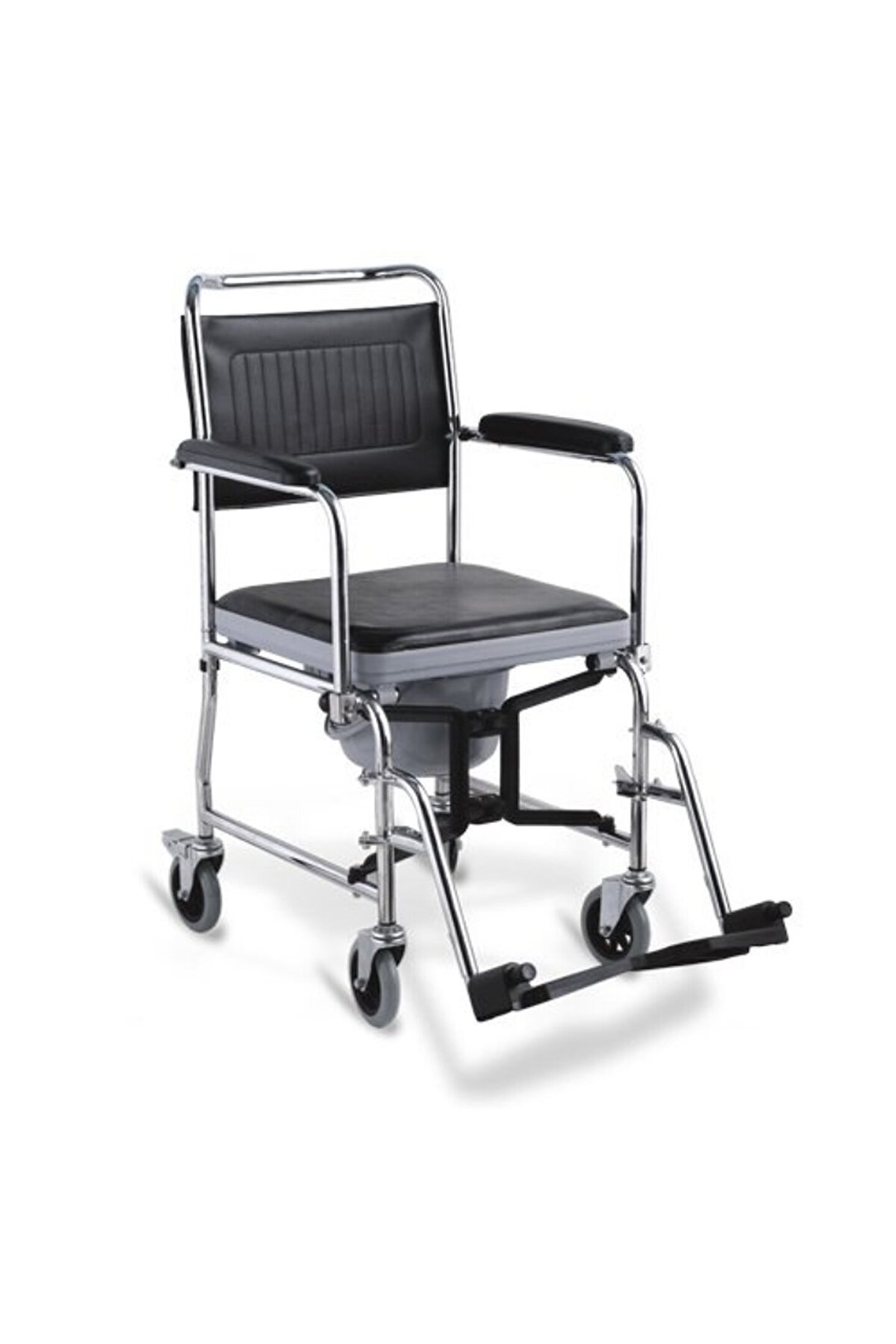 Medikal Hasta Tuvalet Sandalyesi Tekerli Tekerlekli Sandalyeler Çelik Gövde, Krom Kaplama Wc Aparatlı Aşağı Hareketli Yan Kolçaklar Çıkabilen Ayaklıklar Arka Tekerlerde Fren Sistemi Uzun Oturuşlar Için Minderli Klozete Yanaşabilir Çıkabilen Sırtlık Komple Katlanabilir Özelliği