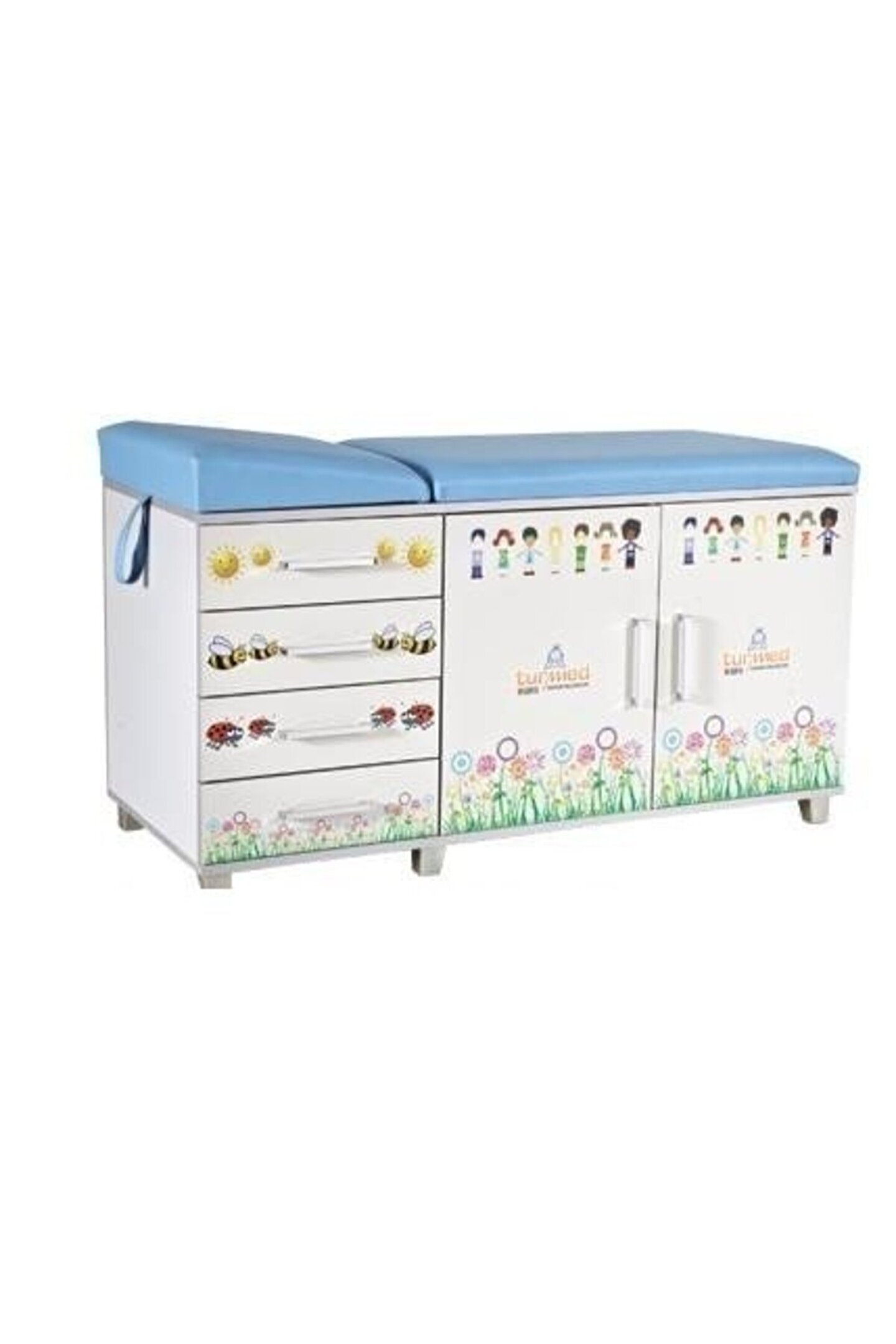ÇOCUK MUAYENE MASASI AHŞAP Çocuk Muayene Masası AhşapSırt kısmı manuel mekanizma ile ayarlanır.Yatak platformunda sünger üzeri vinleks kaplı şilte bulunmaktadır.Gövde komple ahşap malzemeden imal edilmiştir.Gövde üzerinde dört adet çekmece bulunmaktadır.Gövde üzerinde iki kapaklı dolap bulunmaktadır.DIŞ ÖLÇÜLER:En: 600mmBoy: 1400mmYükseklik: 800mm.