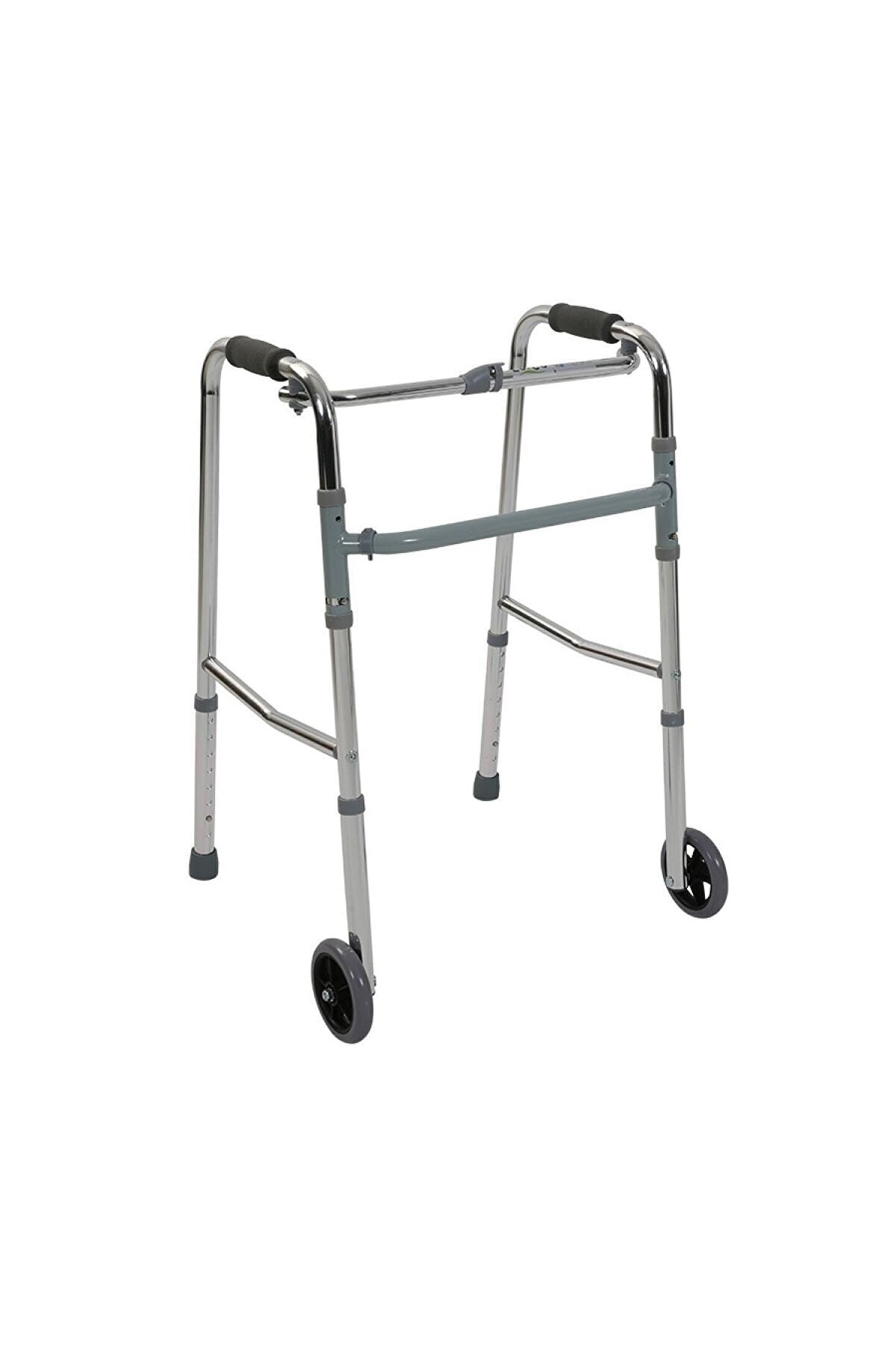 PR-441 Tekerlekli Hareketli Walker • Hafif alüminyum yapısı ile taşıma kolaylığı sağlar. ; • Dönen gövde yapısı kullanıcı ile birlikte hareket etmeye olanak tanır. ; • Ön iki bacaktaki tekerlekleri kullanıcının hareket kabiliyetini artırır. ; • Yerde iz bırakmayan ve kaymayan kauçuk pabucları ile güven verir. ; • Kullanıcı tipine göre 8 kademede bacak boyu ayarlanabilir. ; • Konforlu köpük el tutamaçları ergonomik yapıdadır. ; • Tek buton ile kolayca tek elle katlanabilir. ; • Katlanma özelliği ile kolay taşıma ve depolama sağlar. ; Uzunluk : 52 cm Genişlik : 61 cm Yükseklik : 79-94.50 cm Ürün Ağırlığı : 2.80 kg Malzeme Rengi : Krom Parçaların Rengi : Gri Karton Ölçüleri : 56×31×83 cm Adet/Karton : 1 Adet/Karton #tekerleklisandalye #akülütekerleklisandalye #medikal #engelli #sandalye #yürüteç #walker #wolker #rollatör #baston #kanedyen #koltukaltı #asa #scooter #eczane #bağış #mügeanlı;