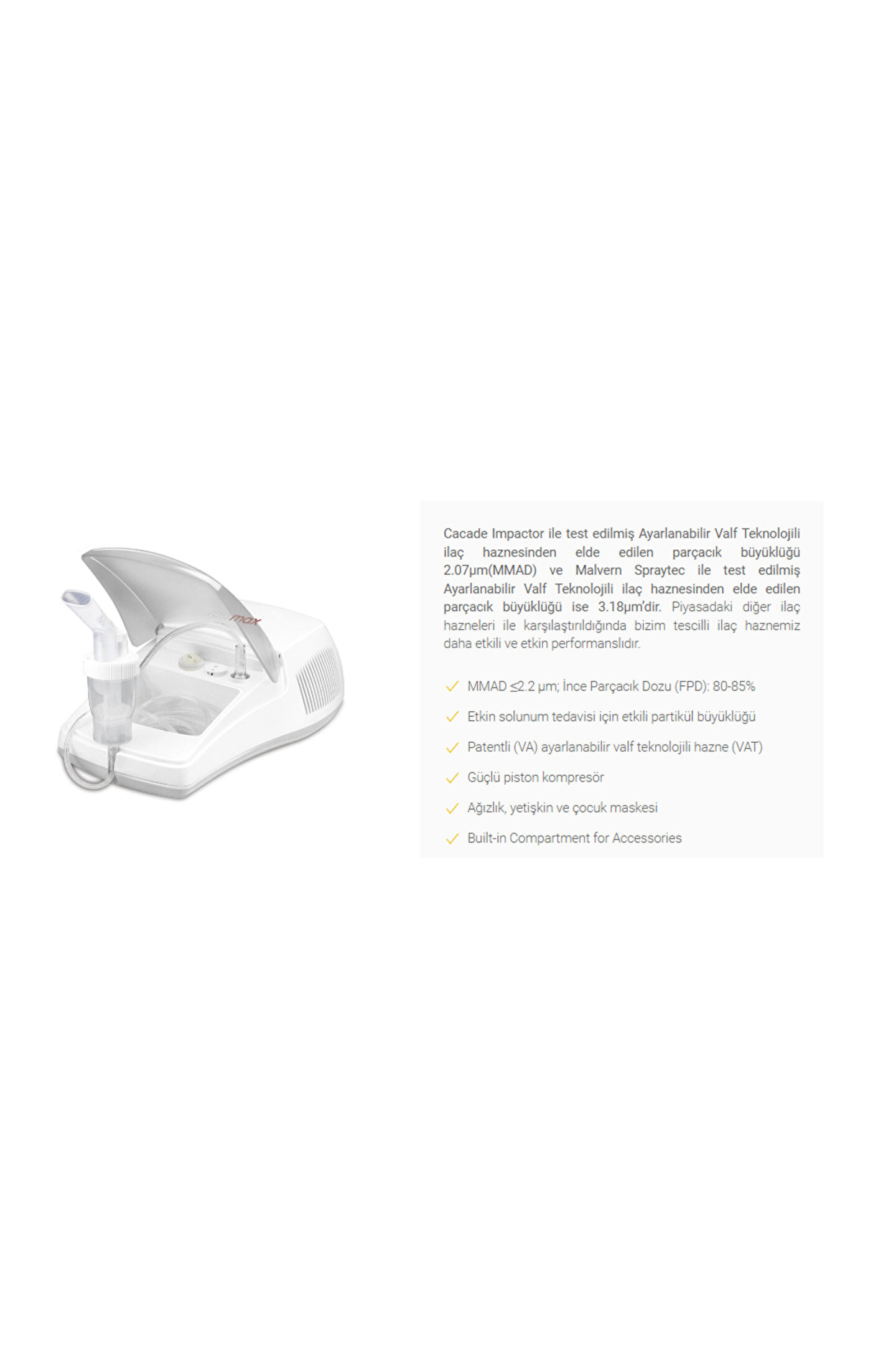 Rossmax NA100 Kompresörlü Nebülizatör, ve gibi solunum bozuklukları ve ventilasyon problemi olan hastalar için kullanıma uygundur. Rossmax NA100 Nebulizatör, sıvı yapıda olan ilaçların buhar yoluyla vücuda alınmasını sağlar. Patentli ayarlanabiliri valf teknolojisi ile kullanıcının ihtiyacına göre ilaçların yoğunlukları ayarlanabilir. Yetişkinlerin ve çocukların kullanımına uygundur. Uygun bakım be kullanımla uzun yıllar güvenilir tedavi imkanı sağlar. İçerdiği azaltılmış ses teknolojisini ile kullanıldığı zamanlarda çok fazla ses çıkartmaz ve gürültü kirliliğinin önüne geçer. Kutu içeriğinde hem yetişkinlerin hem de çocukların kullanımına uygun maskeler yer alır. Soluma borusu gibi aparatlar da kolay bir şekilde monte edilerek kullanılır. Doktorunuzun ve / veya solunum terapistinizin önerdiği şekilde kullanılması önemlidir.