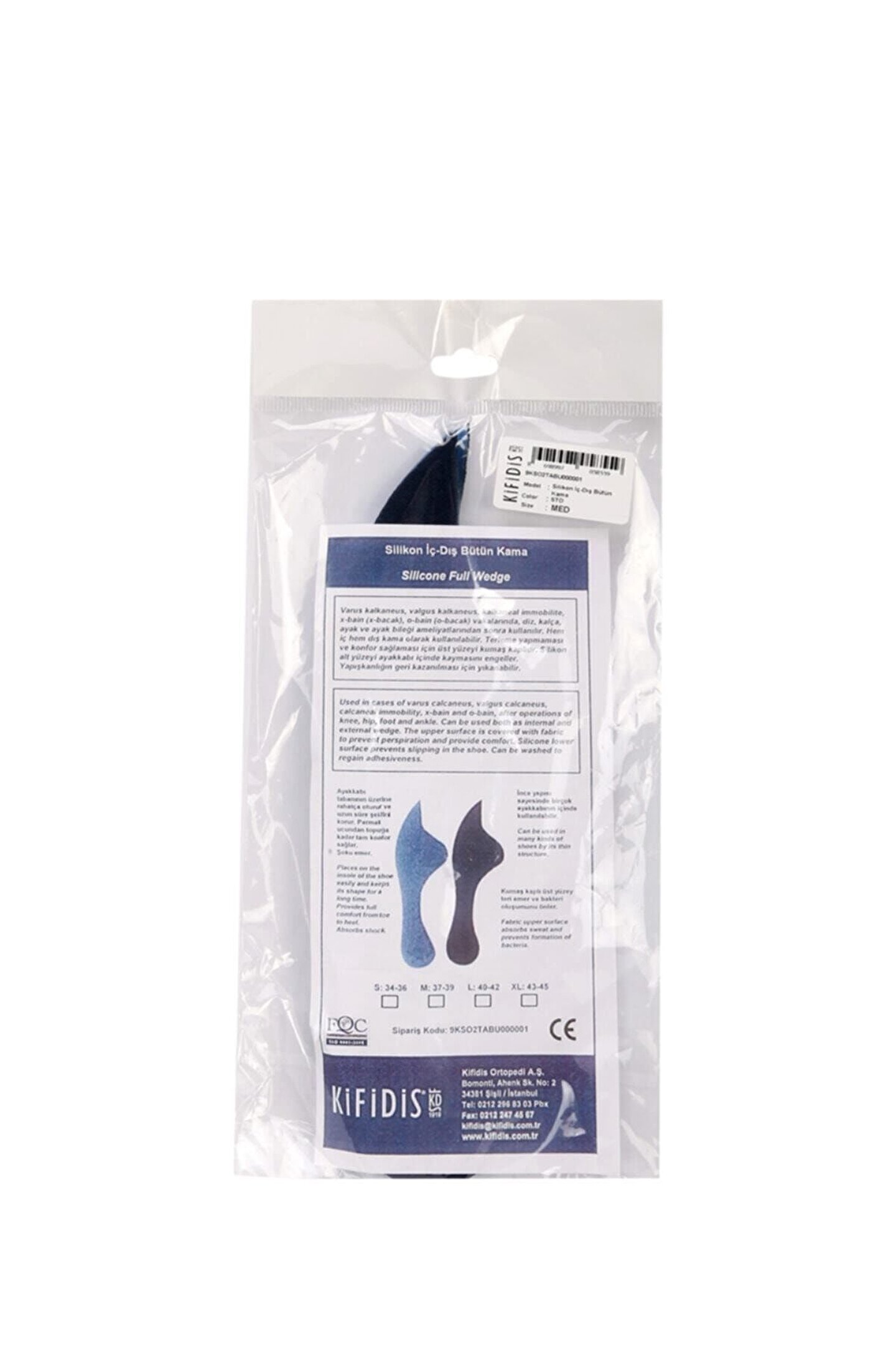Beden:S: 34-36M: 37-39L: 40-42XL: 43-45Varus kalkaneus, valgus kalkaneus, kalkaneal immobilite, x-bain(x bacak), o-bain(o bacak) vakalarında, diz, kalça, ayak ve ayak bileği ameliyatlarından sonra kullanılır.; Hem iç hem dış kama olarak kullanılabilir.; Terleme yapmaması ve konfor sağlaması üst yüzeyi kumaş kaplıdır.; Silikon alt yüzeyi ayakkabı içinde kaymasını engeller.; Yapışlanlığın geri kazanılması için yıkanabilir.; Ayakkabı tabanının üzerine rahatça oturur ve uzun süre şeklini korur.; Parmak ucundan topuğa kadar tam konfor sağlar.; Şoku emer.; İnce yapısı sayesinde birçok ayakkabının içinde kullanılabilir.; Kumaş kaplı üst yüzey teri emer ve bakteri oluşumunu önler.; Used in cases of varus calcaneus, valgus calcaneus, calcaneal immobility, x-bain and o-bain, after operations of knee, hip, foot and ankle.; Can be used both as internal and external wedge.; The upper surface is covered with fabric to prevent perspiration and provide comfort.; Silicone lower surface prevents slipping in the shoe.; Can be washed to regain adhesiveness.; Place on the insole of the shoe easily and keeps its shape for a long time.; Provides full comfort from toe to heel.; Absorbs shock.; Fabric upper surface absorbs sweat and prevents formations of bacteria.