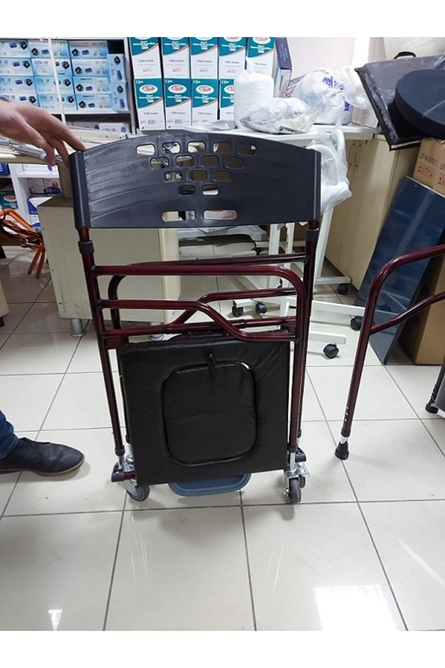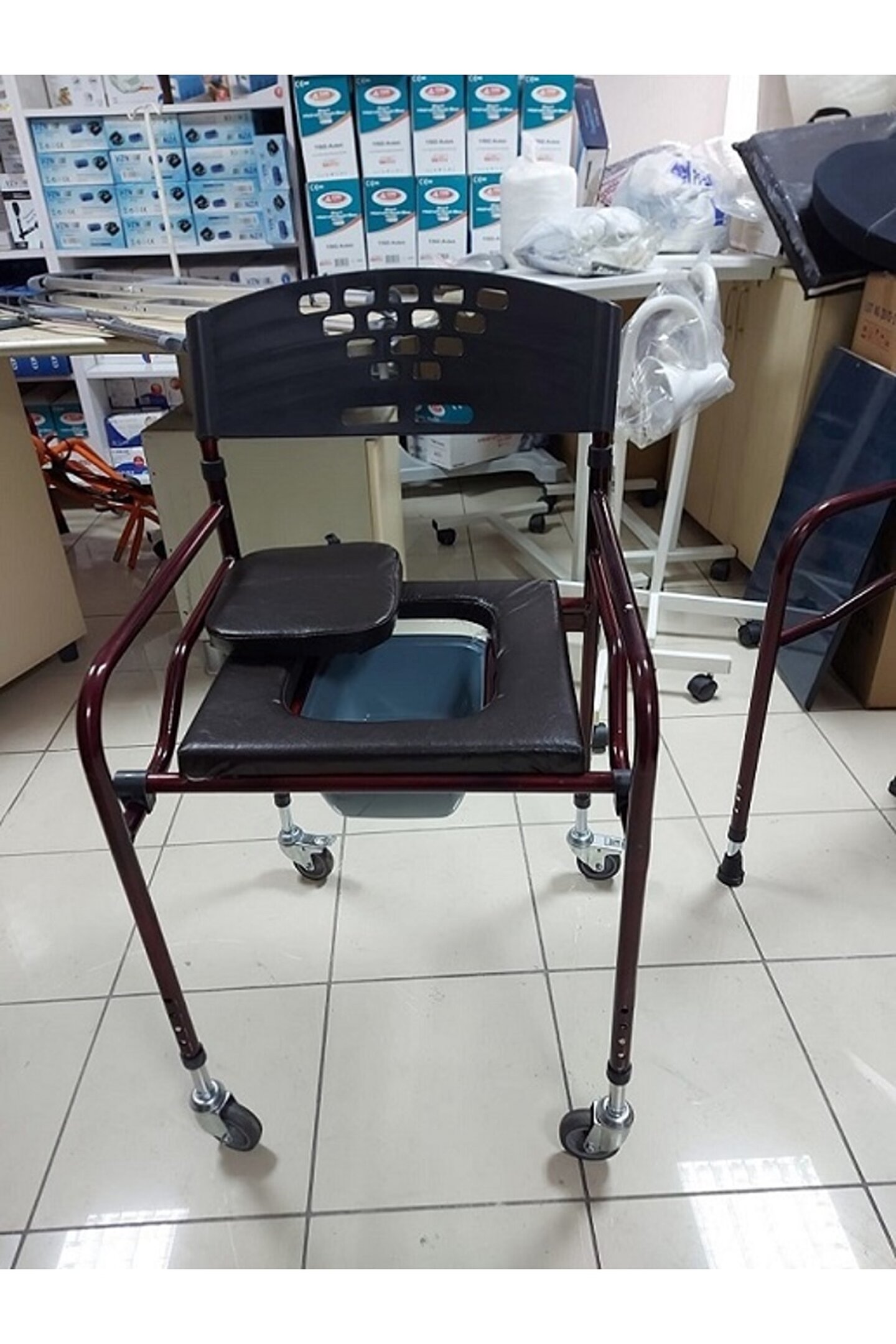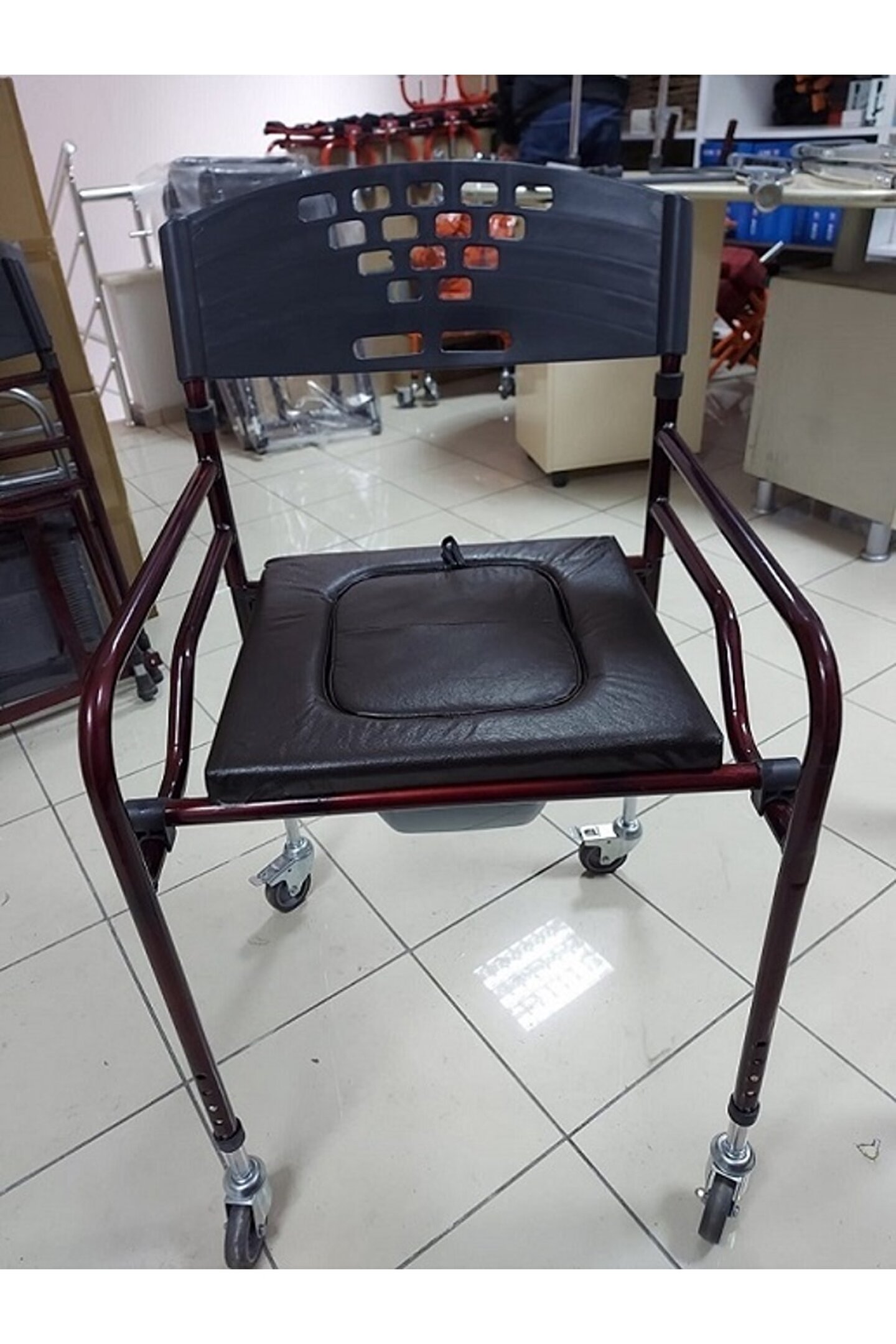 Tekerlekli Tuvaletli yükseklik ayarlı 2si frenli 4 tekerlekli kovası 120 kg aşıma kapasitesi; 45 cm iç genişlik DERİ DÖŞEMELİ YUMUŞAK SÜNGERLİ KATLANABİLİİR;