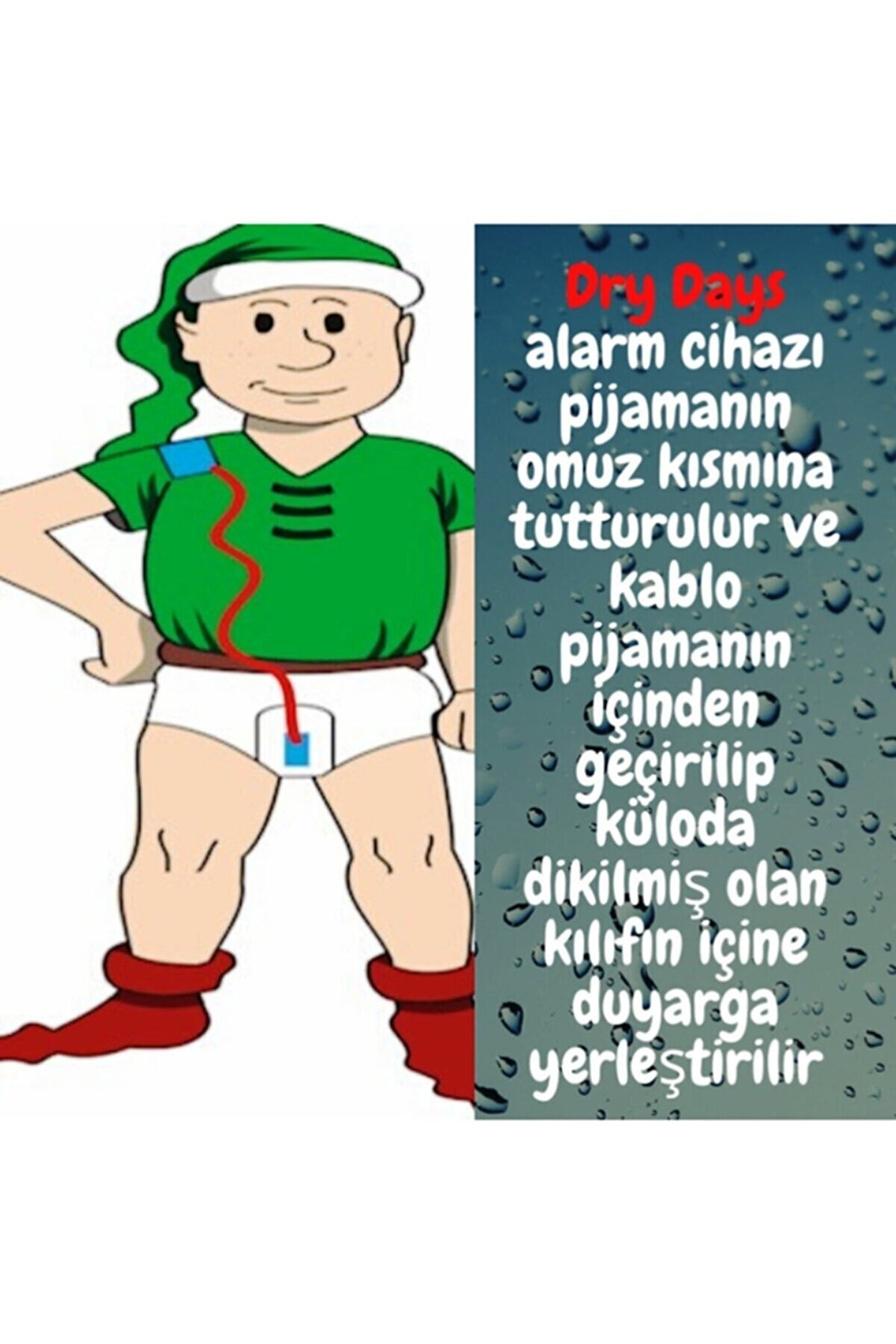 ENÜREZİS Yatak Alt Islatma İdrar Alarm Cihazı UYARAN tam özellikli düşük maliyetli Ürün Açıklaması Kullanımı rahat ve kolaydır.; Dry days Enuresis alarm, giysi üzerinde taşınabilir ve iki parçadan oluşur.; Alarm cihazı pijamanın omuz kısmına tutturulur ve ara kablo pijamanın içinden geçirilip, külota dikilmiş olan kılıfın içine duyarga yerleştirilir İdrarın ilk salınımıyla birlikte devreye giren alarm çalışmaya başlar ve kişiyi UYARIR ;
