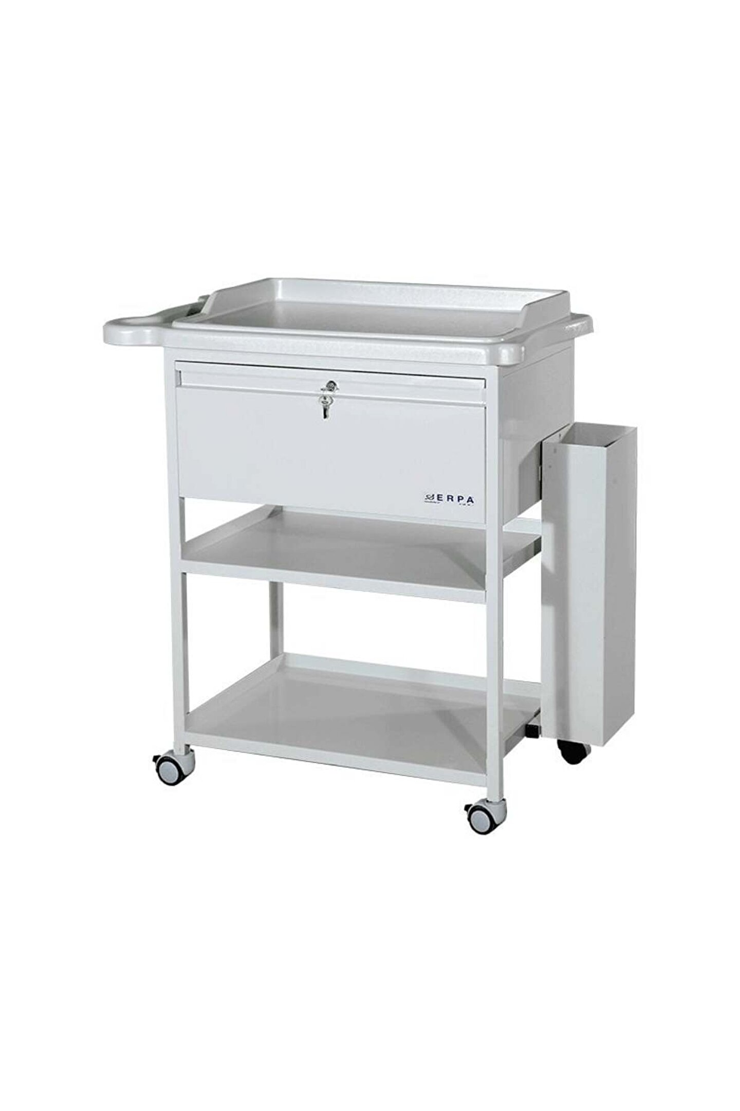 Yoğun Bakım Arabası Tedavi Arabası Pansuman Arabası elektrostatik toz boya ABS antistatik ikisi frenli dört adet teker Metal gövde Kilitli çekmece ABS üst tezgah İki raflı Kateter koyma aparatı İtme kolu 50 x 60 x 92 cm 25 kg.;