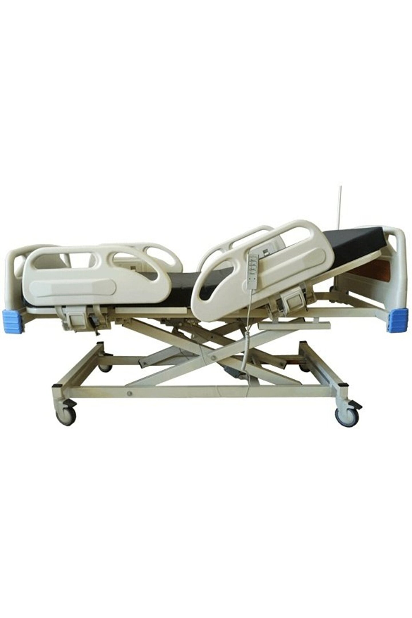 3 Motorlu Hasta Karyolası Anti Dekübit Yatak Uzun süre yatan hastalarda oluşan yatma (dekübit) yaralarını engelleyen özel olarak tasarlanmış lazer hava kanallı sıvı geçirmez yatak.; ; Pozisyon ve Hareketler Elektronik başucu, ayakucu, yükseklik ayarları.; ; Trendelenburg ve Ters Trendelenburg.; ; Fowler, Vasküler, Kardiyak,Auto-contour ve Sırt ve ayakucu kaydırma sistemi.; ; Teknik Özellikler Yerden yatma yeri yüksekliği 49 - 78 cm arası ( yataklı 62 - 91 cm arası ) Korkuluk yüksekliği 34 cm ( yataklı 21 cm) Başlık ve ayakucu yüksekliği 49 cm (yataklı 36 cm) Karyola ebatları 210*110*98 cm Yatak ölçüleri 190*90*13 cm Diğer Özellikler Kitlenebilir, gizlenebilen PP yan korkuluklar, çıkarılabilir PP başucu ve ayakucu paneller, boyama öncesi otomatik makinelerde yıkama ve temizlik, elektrostatik toz boyalı metal gövde, kademeli olarak ayarlanabilir ayakucu, iki yanda idrar torba kancası, dört köşede serum askısı yuvaları, serum askısı, koruyucu köşe tamponları, kilitlenebilir tekerlekler.; ; Opsiyonel Özellikler Elektronik tartı sistemi, sırt kısmında manuel CPR, akü, yatak boyu uzatma, oksijen tüp taşıyıcı, sırt kısmında X-ray kaset yuvası, tutunma kolu, nevresim rafı, monitör sehpası, dosya taşıyıcı.;