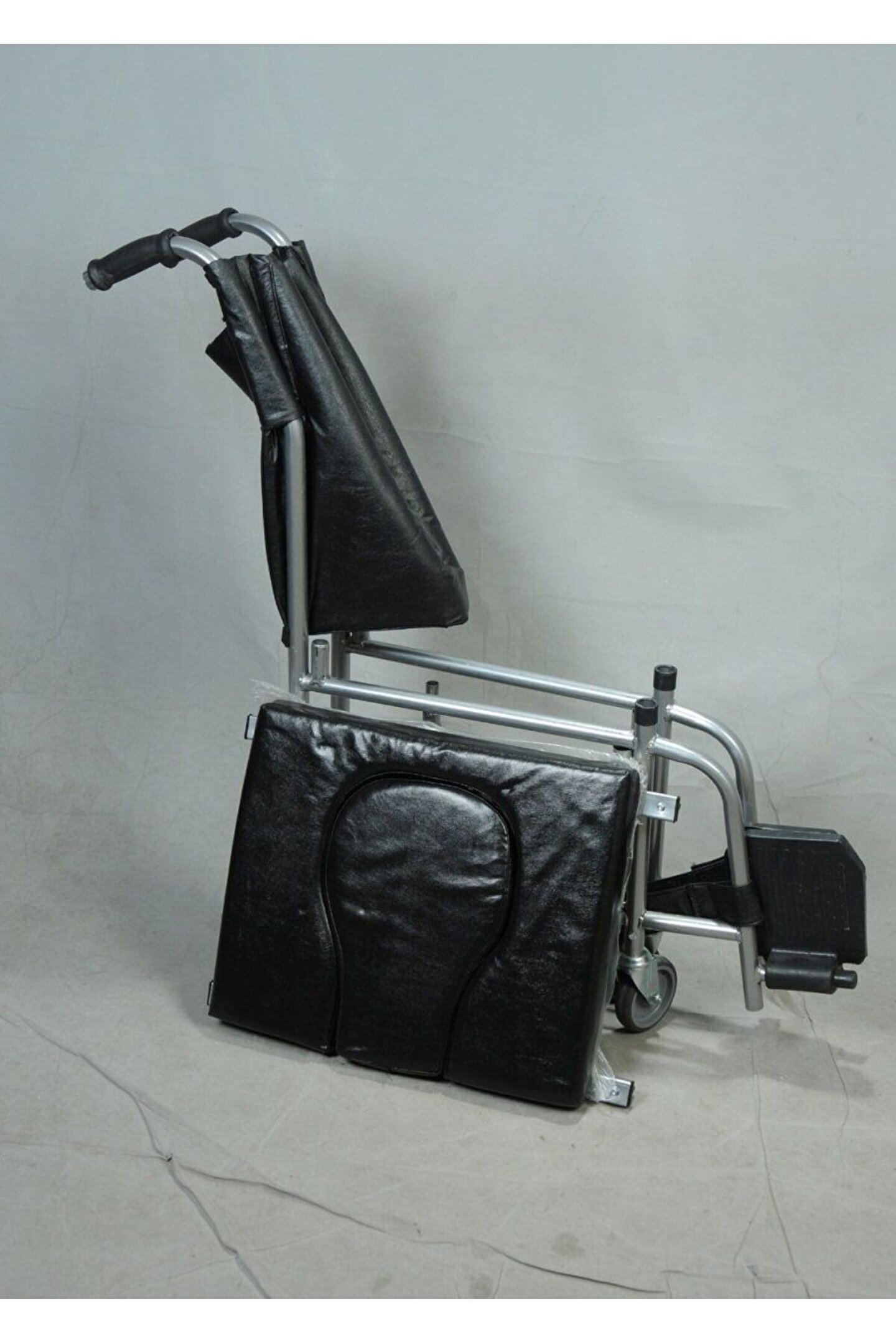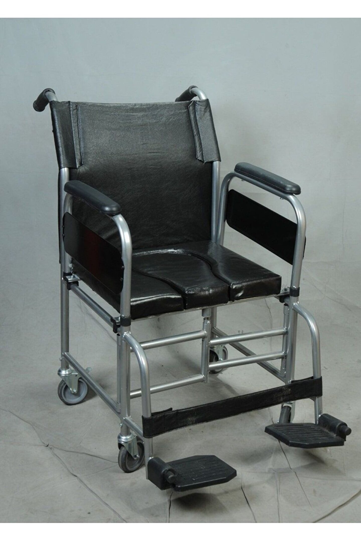 ENGELLİ SANDALYESİ Banyo ve tuvalet arabası küçük teker yerli. Oturma, sırt ve kolçak sünger üzeri vinleks kaplıdır. • Gövde katlanabilir. • Ayak koyma yeri katlanabilir. • Oturma yeri altında lazımlık bulunur. • Lazımlık yeri kapaklıdır. • 360 derece dönebilen dört adet tekerlek bulunmaktadır. • Arka tekerlekler fren tertibatlıdır. • Tüm metal aksamı STATİK BOYA kaplanmıştır.