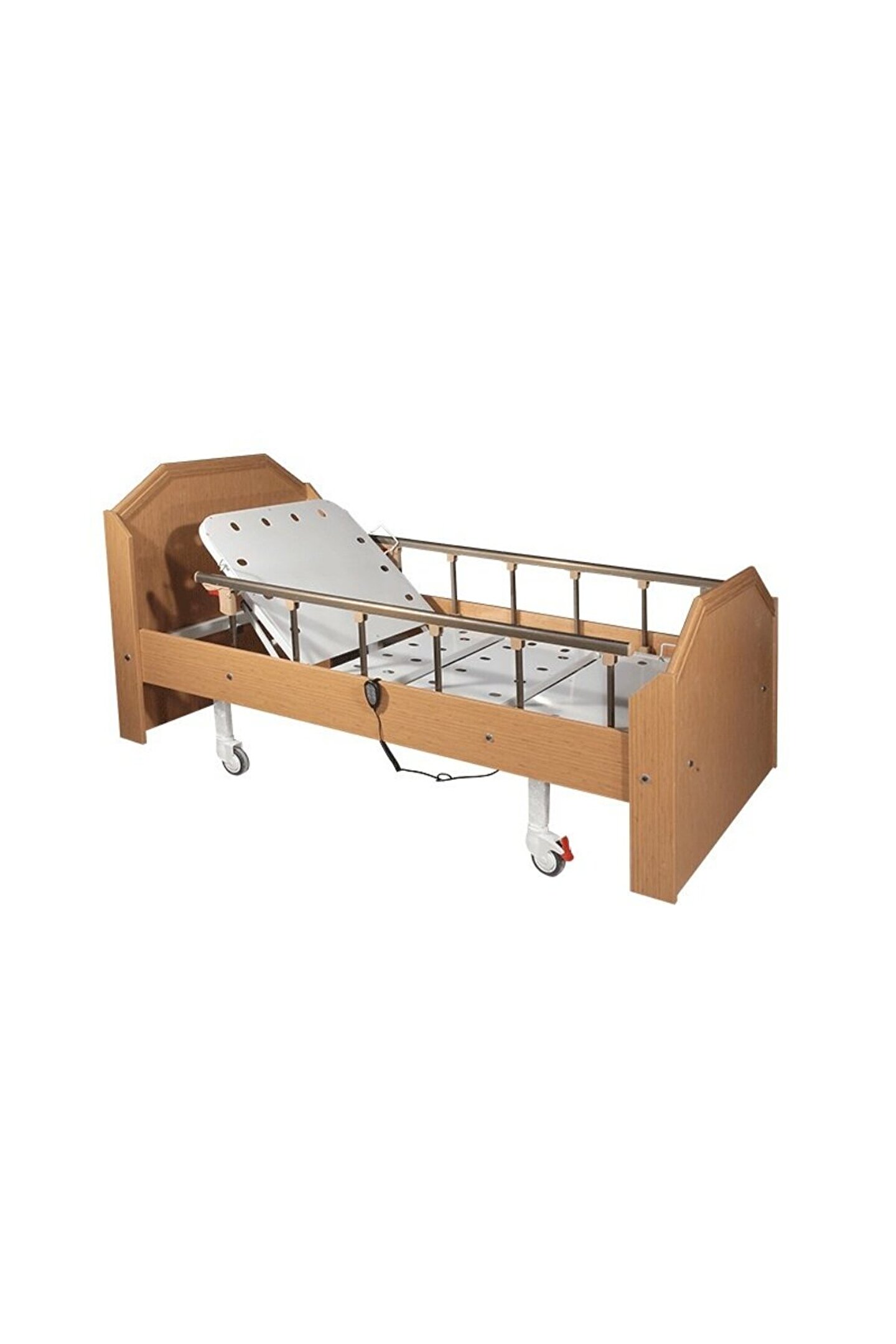 Elektrik motorlu baş ve ayak kısmı hareketi ABS antistatik ikisi frenli dört adet teker Alüminyum korkuluk sistemi Ahşap gövde ve başlıklar Serum askısı El kumandası 100 x 200 x 45 cm 65 kg.